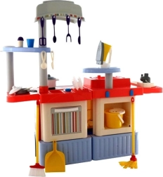 Robustna plastična konstrukcija in premišljeni shranjevalni prostori podpirajo organiziranost in otroke učijo osnovnih domačih veščin. Delovna plošča na višini približno 50 cm in skupna višina 100 cm sta idealni za udobno in varno igro.
