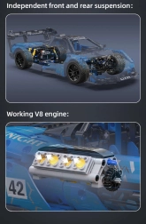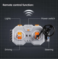 Model je mogoče razširiti z RC komponentami (niso v paketu): baterija 7,4 V, daljinski upravljalnik, L motor pro, servomotor pro in LED osvetlitev. Po dodani RC opremi se vozi naprej/nazaj, zavija levo/desno in omogoča prižiganje in ugašanje sprednjih in zadnjih luči. Vrata se odpirajo navzgor in zapirajo s pomočjo vrtljivega krmilnika. Priložena je jasna navodila korak za korakom, zato se lahko modela lotijo tudi mlajši graditelji ob pomoči odraslih.