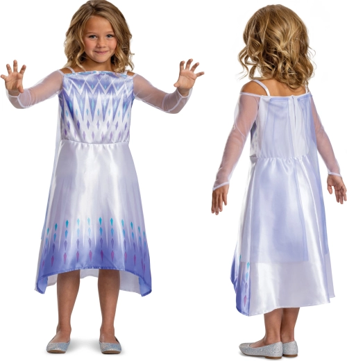 Spremenite vsakdanjo igro v ledeno kraljestvo s kostumom, navdihnjenim po junakinji ELSA iz filma DISNEY FROZEN. Obleka v nežnih tonih bele, lila in srebrne ima prosojne rokave, potiskan životec z “ledenimi” motivi ter tekoče krilo z mehkimi barvnimi prelivi in drobnimi diamantnimi vzorci.