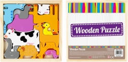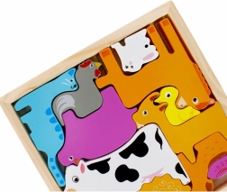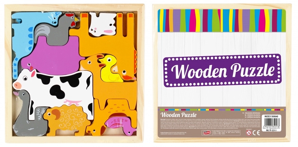 Ta lesena sestavljanka z živalmi je odličen izobraževalni dodatek za otroško sobo. Otroci vstavljajo posamezne lesene koščke v ustrezne izreze in tako urijo prostorsko predstavo, potrpežljivost in koordinacijo oko–roka. Robustni, barviti koščki so enostavni za prijem tudi z malimi prstki.