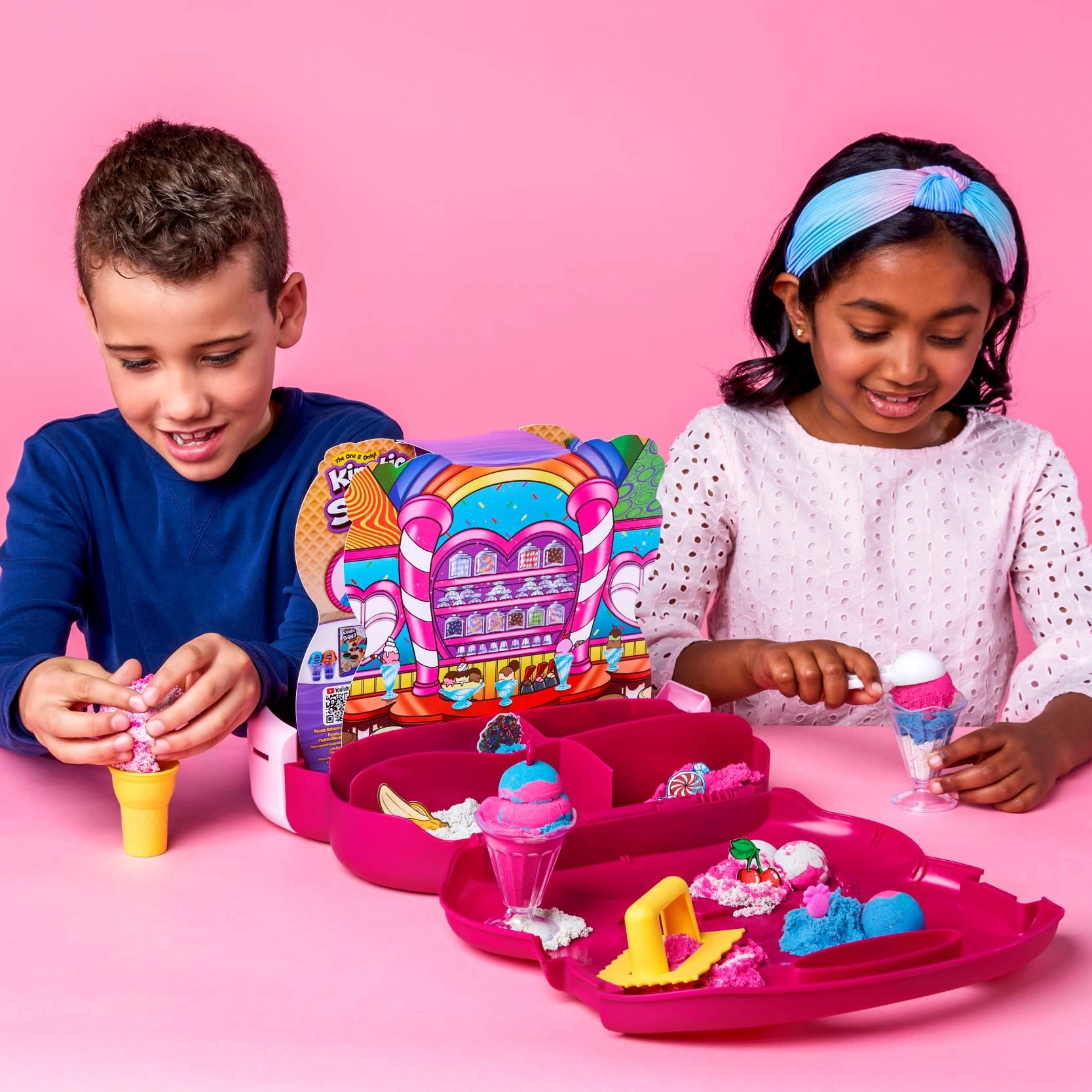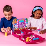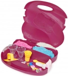 Set Ice Cream Station v čvrstem prenosnem kovčku prinaša 3 barve peska (skupaj 680 g) ter vrsto orodij: kozarčke, zajemalke, žličke in modelčke za realistične sladice. Odlično za doma in na poti – vse ima svoje mesto in po igri se zlahka pospravi.