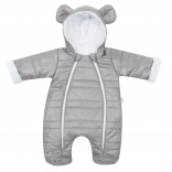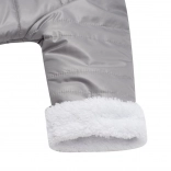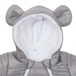 Praktične podrobnosti, kot so kapuca z ljubkimi ušeski, zavihljivi rokavi z toplo obrobo in pokrite nožice, ohranjajo dojenčka toplega od glave do peta. Kombinezon je odlična izbira za voziček, nosilko in zimske sprehode.