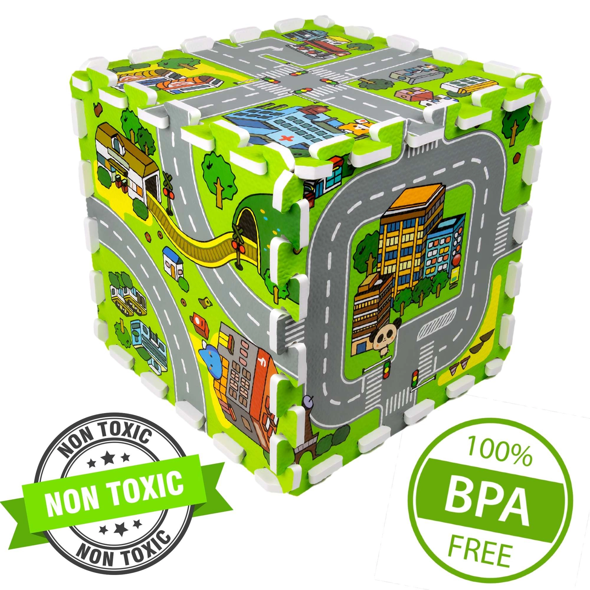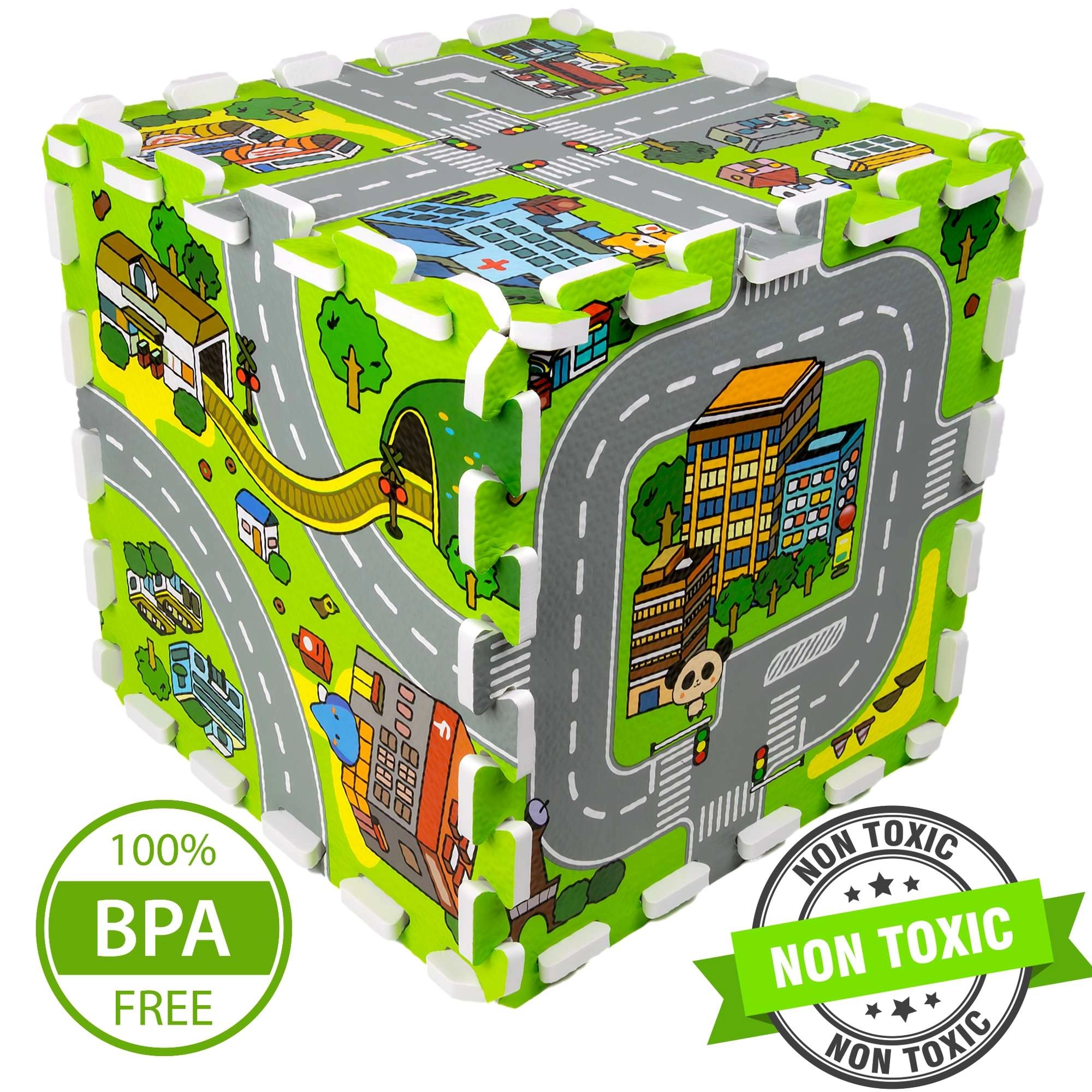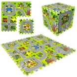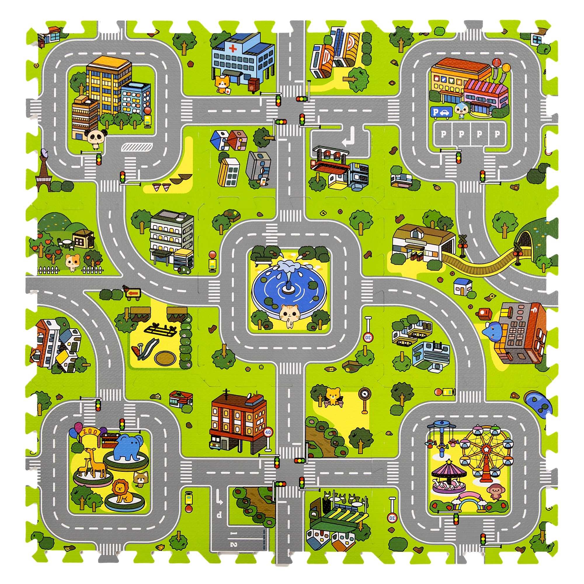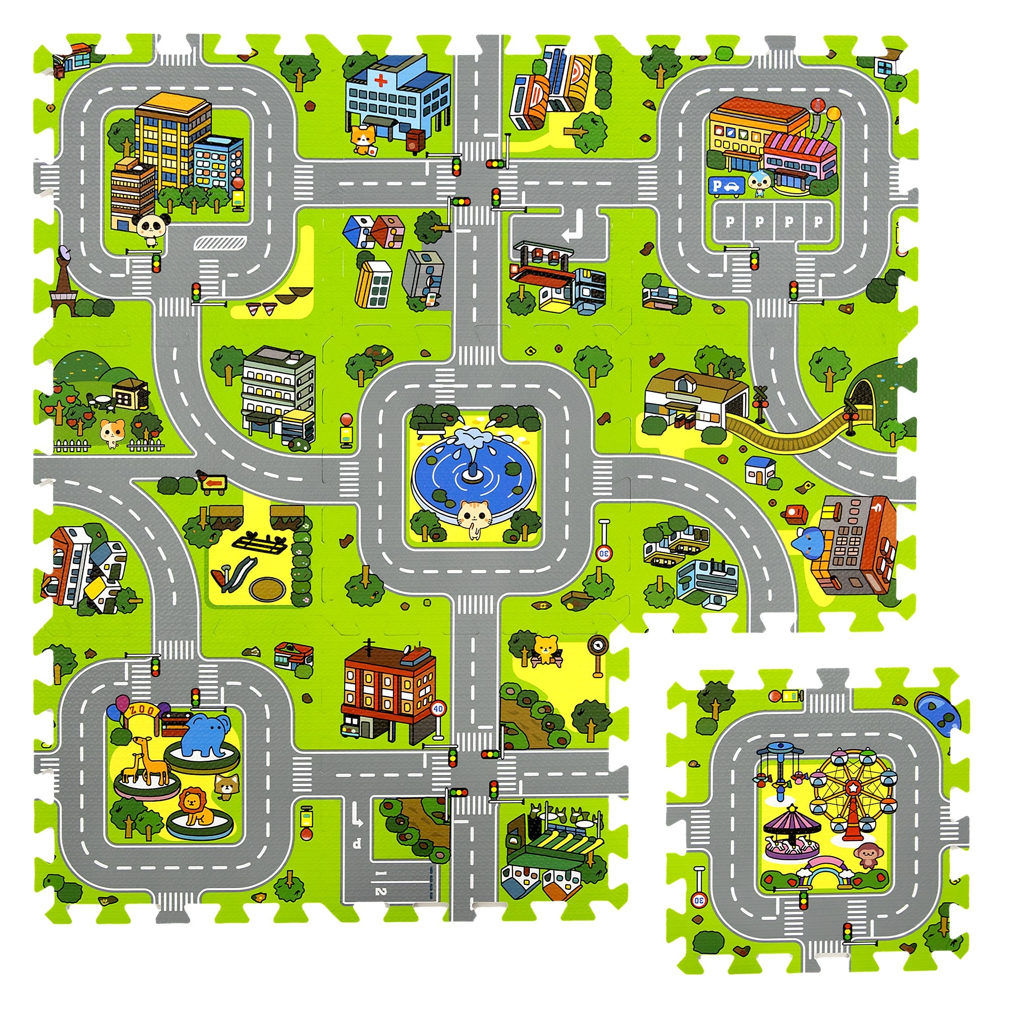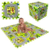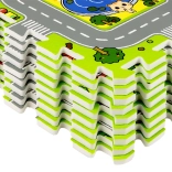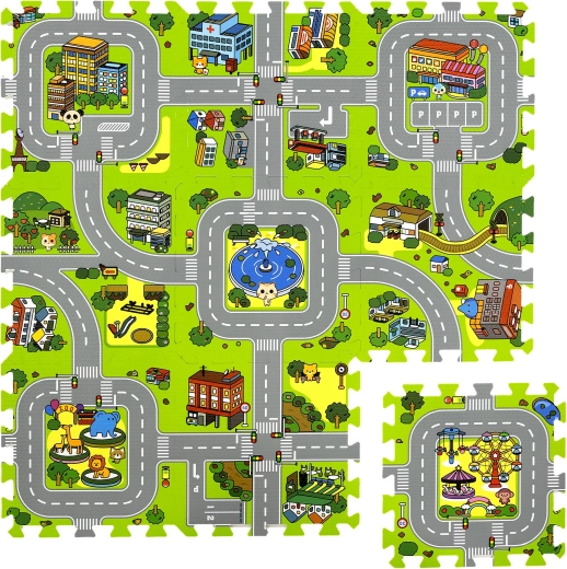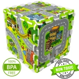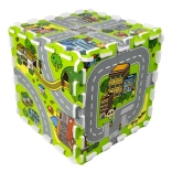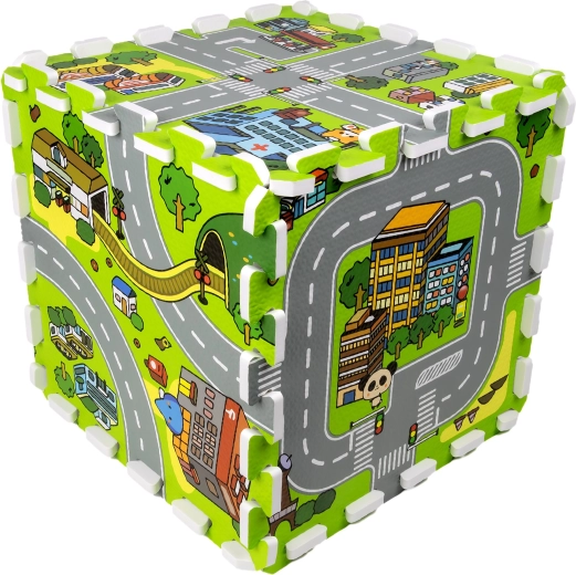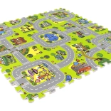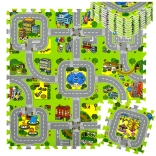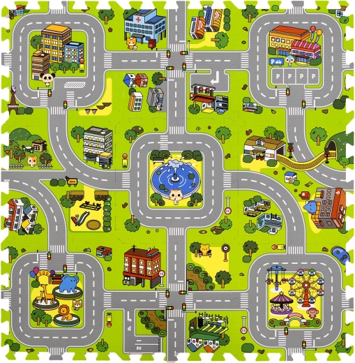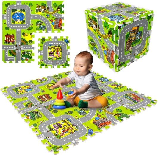 Mehka EVA penasta podloga velikosti 90 × 90 × 1 cm, sestavljena iz 9 delov z motivom mesta in cest, otrokom nudi varno in udobno mesto za igro in prve korake. Deli se zlahka sestavljajo, razširjajo in omogočajo tudi tvorjenje 3D oblik. Podloga je vodoodporna, proti zdrsu, ublaži udarce in izolira pred mrazom tal.