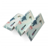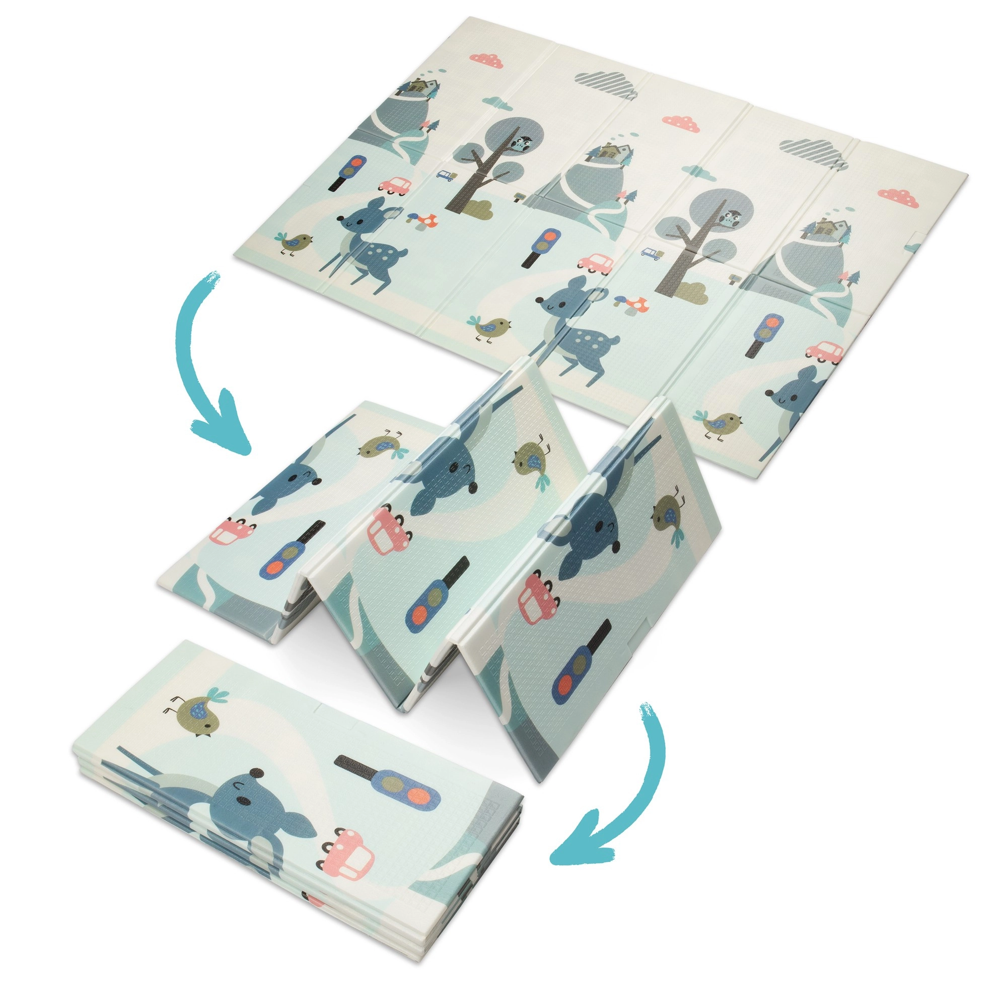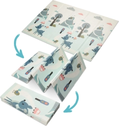 Podloga je zložljiva kot harmonika, zato jo v nekaj sekundah razgrnete ali pospravite. Je lahka, vodoodporna in dovolj jo je obrisati z vlažno krpo – odlična izbira tudi za alergike, saj ne zadržuje prahu niti pršic. Priložena je torba z zadrgo in ročaji za udobno prenašanje na vrt, balkon, piknik ali na potovanja.
