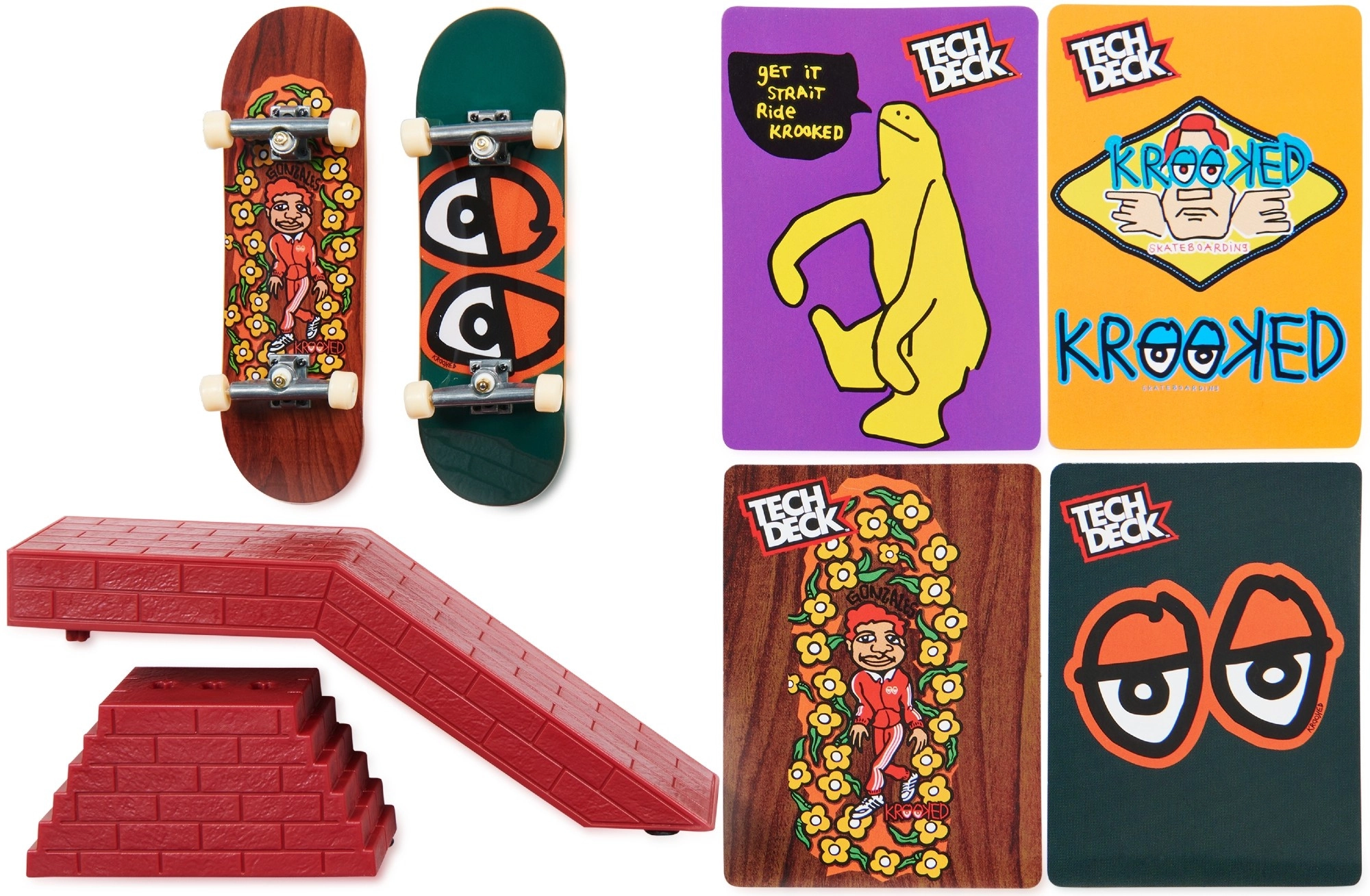 Set TECH DECK VS Series Krooked prinaša realističen fingerboarding za začetnike in napredne. Dve natančno izdelani mini deskorolki s kovinskimi trucki in funkcionalnimi kolesci dopolnjuje ciglasta rampa z oviro, na kateri zlahka natrenirate grinde, ollie in druge priljubljene trike.