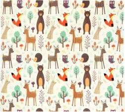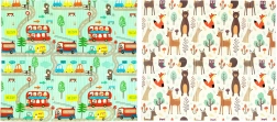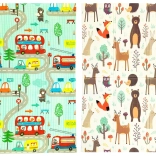 Dve poučni grafiki spodbujata razvoj domišljije in učenja: ljubke gozdne živalice ter pisane ulice na turkiznem ozadju.
