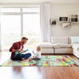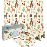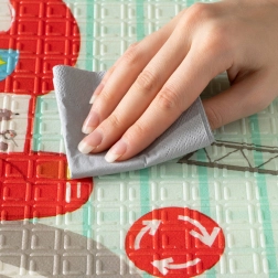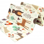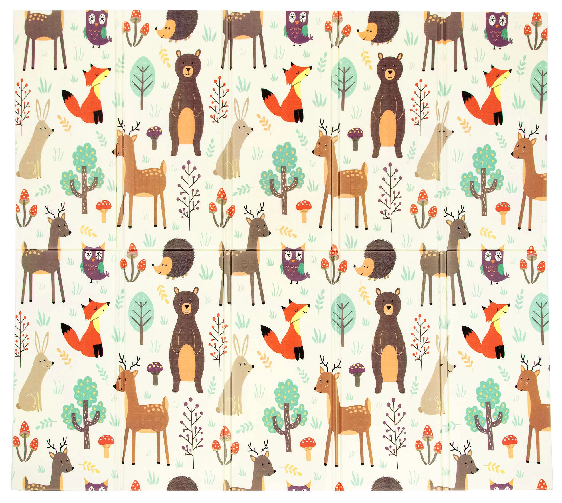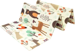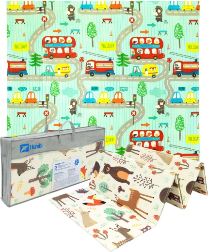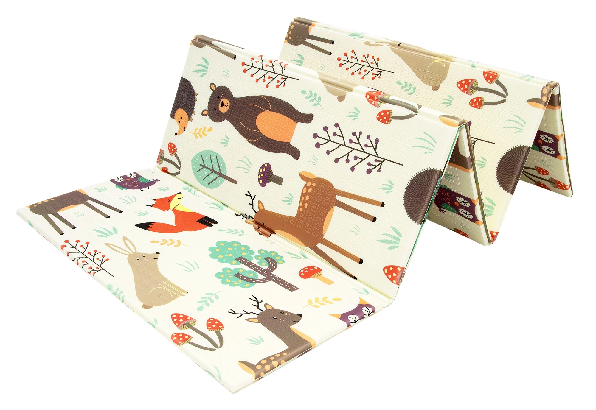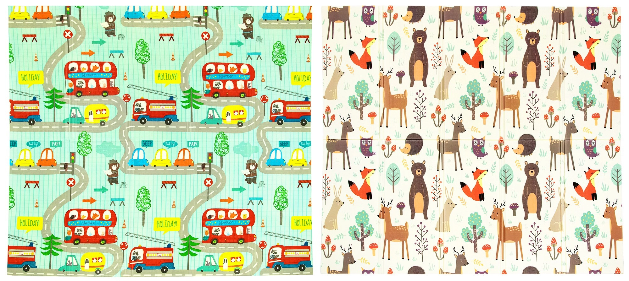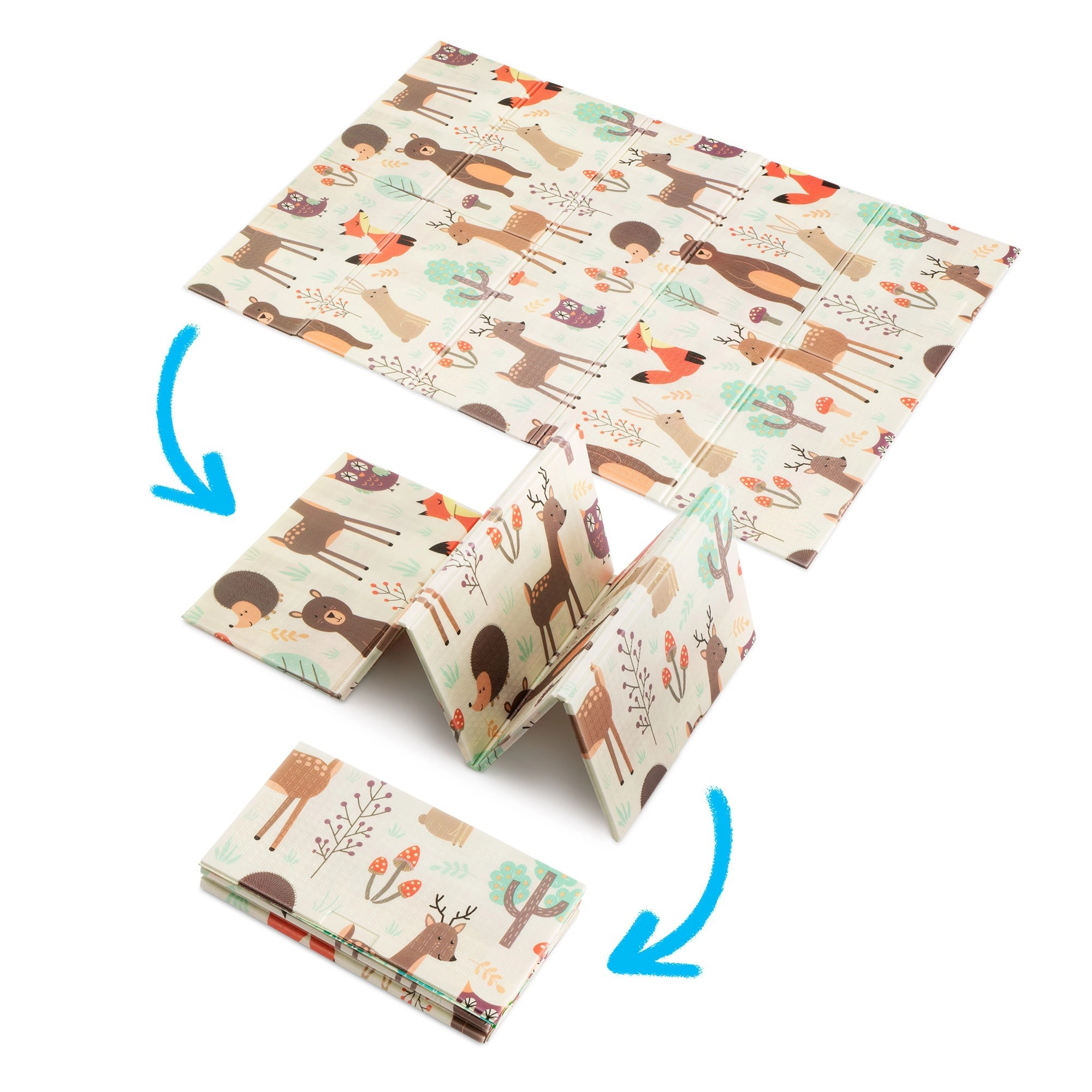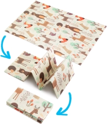 Podloga je dvostranska: ena stran prinaša nežne motive gozdnih živalic, druga zabavne pisane ulice. Enostavno se zloži na kompakten format, je lahka in jo lahko zahvaljujoč torbi z zadrgo in ročaji vzamete v dnevno sobo, otroško sobo, na vrt ali piknik. Vodoodporna površina se zlahka obriše z vlažno krpo – higienska rešitev, primerna tudi za alergike.