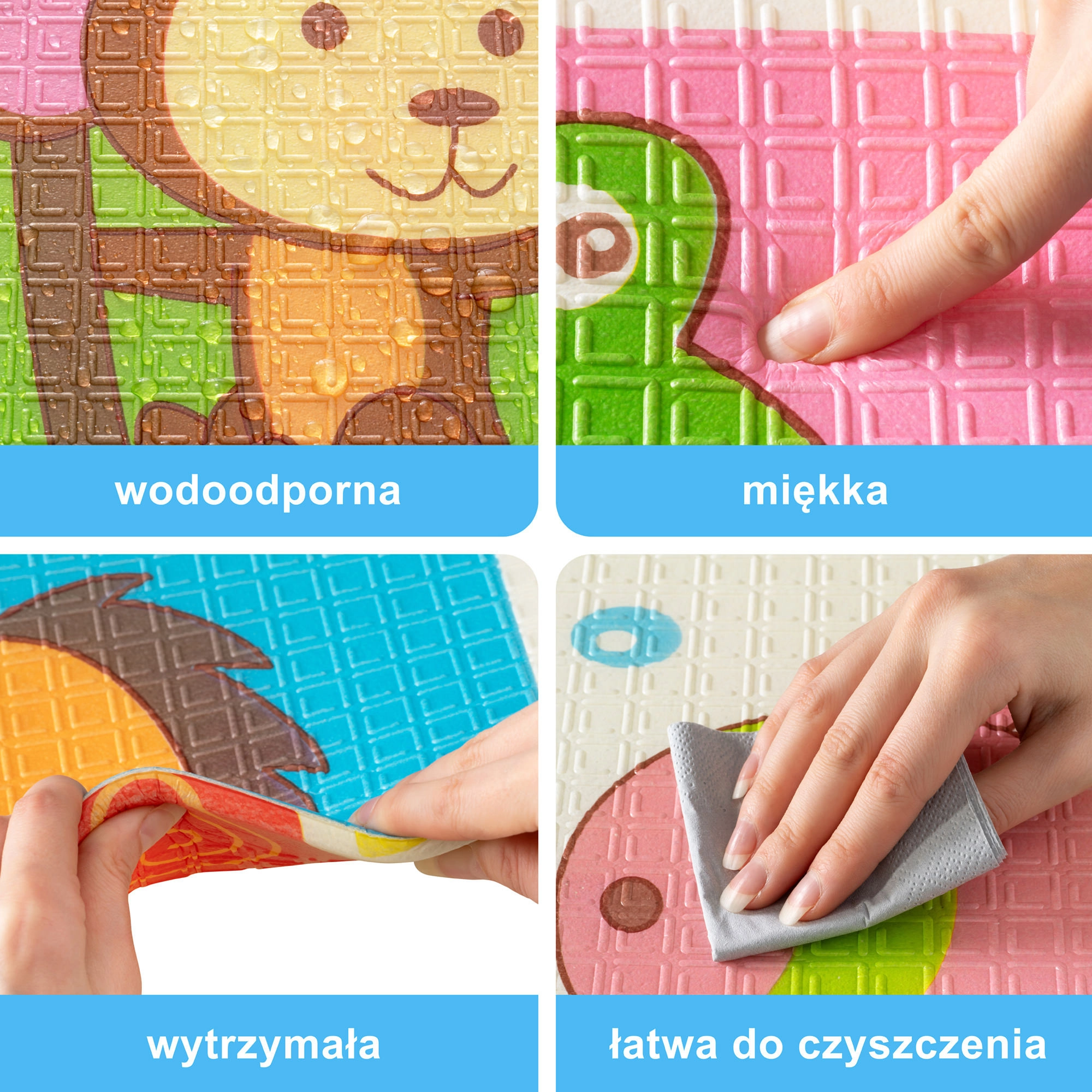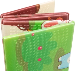 Podloga je hipoalergena, brez vonja in ne vsebuje formamida, ftalatov, PVC ali BPA. Proti-zdrsna, nežno strukturirana površina pomaga pri varnem plazenju in hoji. Zložljiva konstrukcija omogoča hipno zlaganje in kompaktno shranjevanje pod posteljico ali med pohištvo; vse dopolnjuje zapiralna transportna torba.