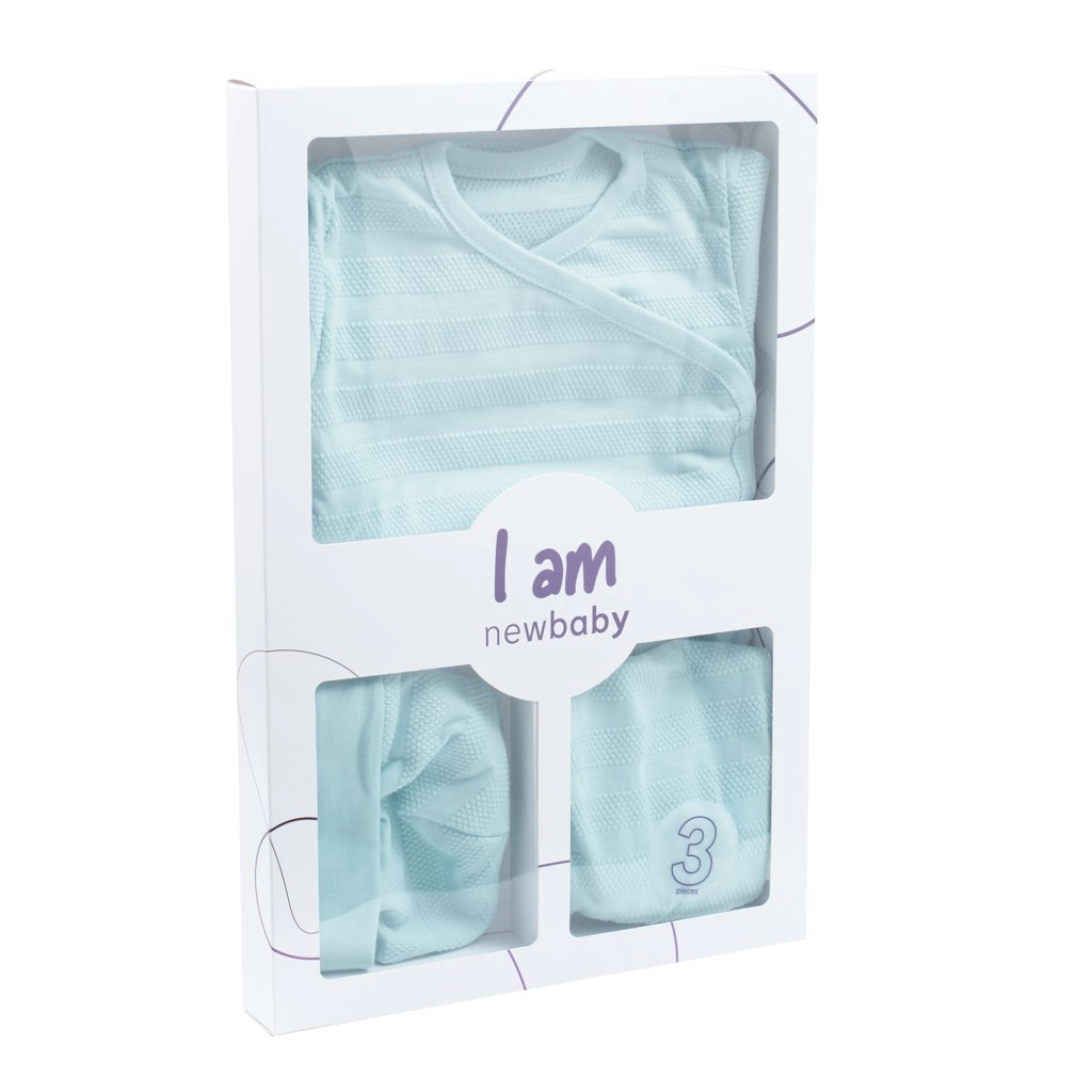 Ta novorojenčkov komplet New Baby I AM je zasnovan z mislijo na maksimalno udobje in varnost. Celorazpirni bodi z zapenjanjem na nete po celotni dolžini in med nogicami olajša preoblačenje in previjanje. Polkopalčke s širšim pasom ne tiščijo in odlično ostanejo na mestu. Kapica s širšim robom ne pada in prijetno sedi.