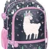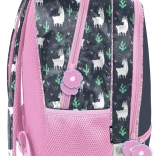 Sodoben šolski nahrbtnik znamke Paso v sivo–rožnati barvni kombinaciji z ljubko lamo in mehkim »kosmatim« detajlom. Je lahek, ima ergonomske, nastavljive naramnice, eno veliko komoro, manjšo komoro, sprednji žepek in stranska mrežasta žepa. Odporen proti premočenju, z odsevnimi elementi in ojačanim dnom za udobno vsakodnevno nošenje.