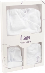 Ta novorojenčkov komplet NEW BABY I AM je zasnovan z mislijo na občutljivo kožo dojenčkov. Nežen in zračen bombaž nudi celodnevno udobje, medtem ko praktične podrobnosti olajšajo vsakodnevno previjanje in oblačenje. Nevsiljiva bela barva in čist dizajn ustrezata tako deklicam kot dečkom.