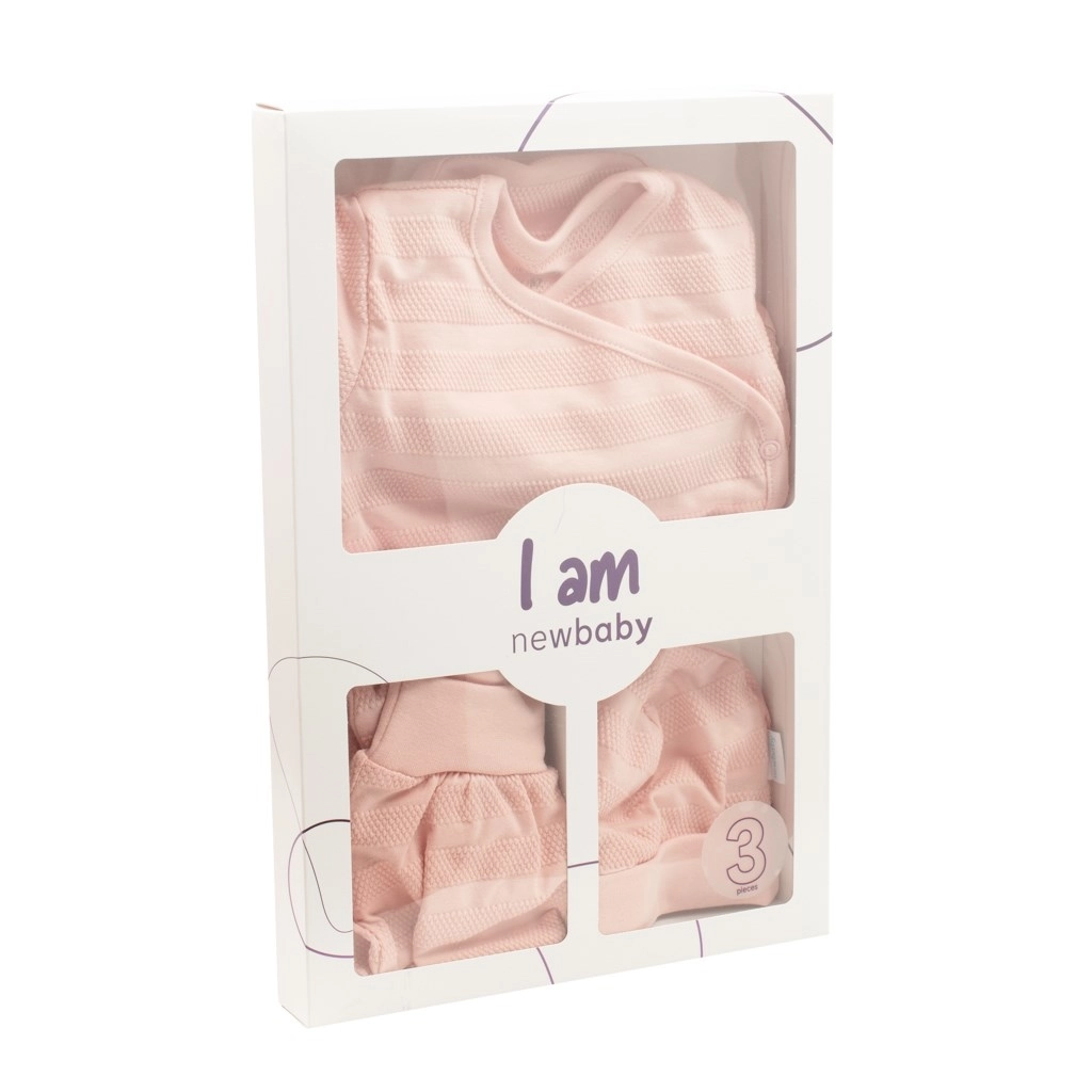 Ta 3-delni dojenčkov komplet NEW BABY I AM je zasnovan z mislijo na občutljivo kožo dojenčkov. Nežen bombaž, udobni kroji in premišljeni detajli olajšajo vsakodnevno oblačenje in previjanje. Nevtralno roza videz z diskretno teksturo deluje nežno in čisto.