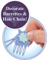 Krtača, okrasna verižica za lase, 4 kristalčki, 4 sponke, 4 elastike in 2 pramena za pletenje – vse, kar otroci potrebujejo za ustvarjanje izvirnih pričesk.