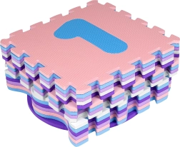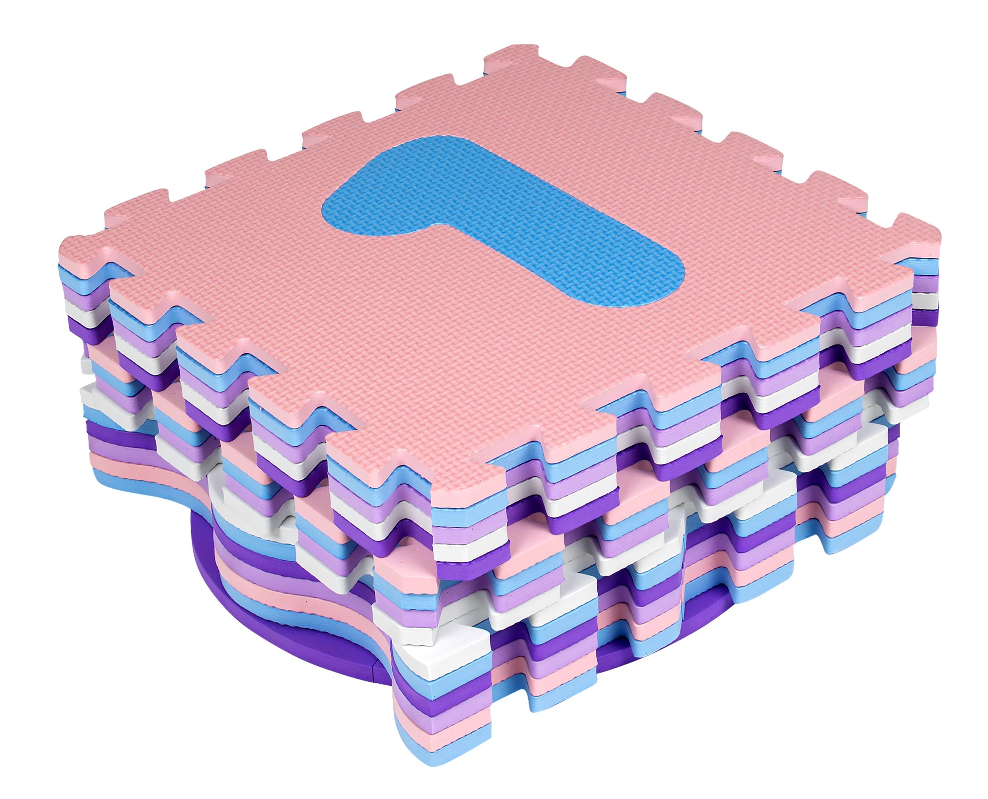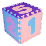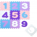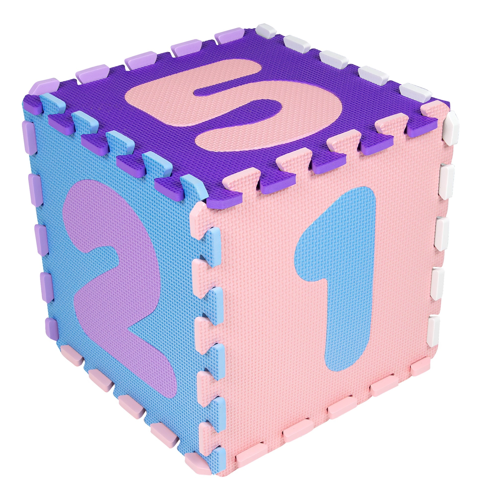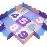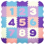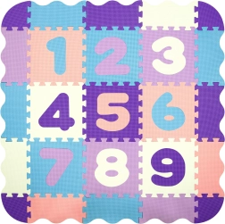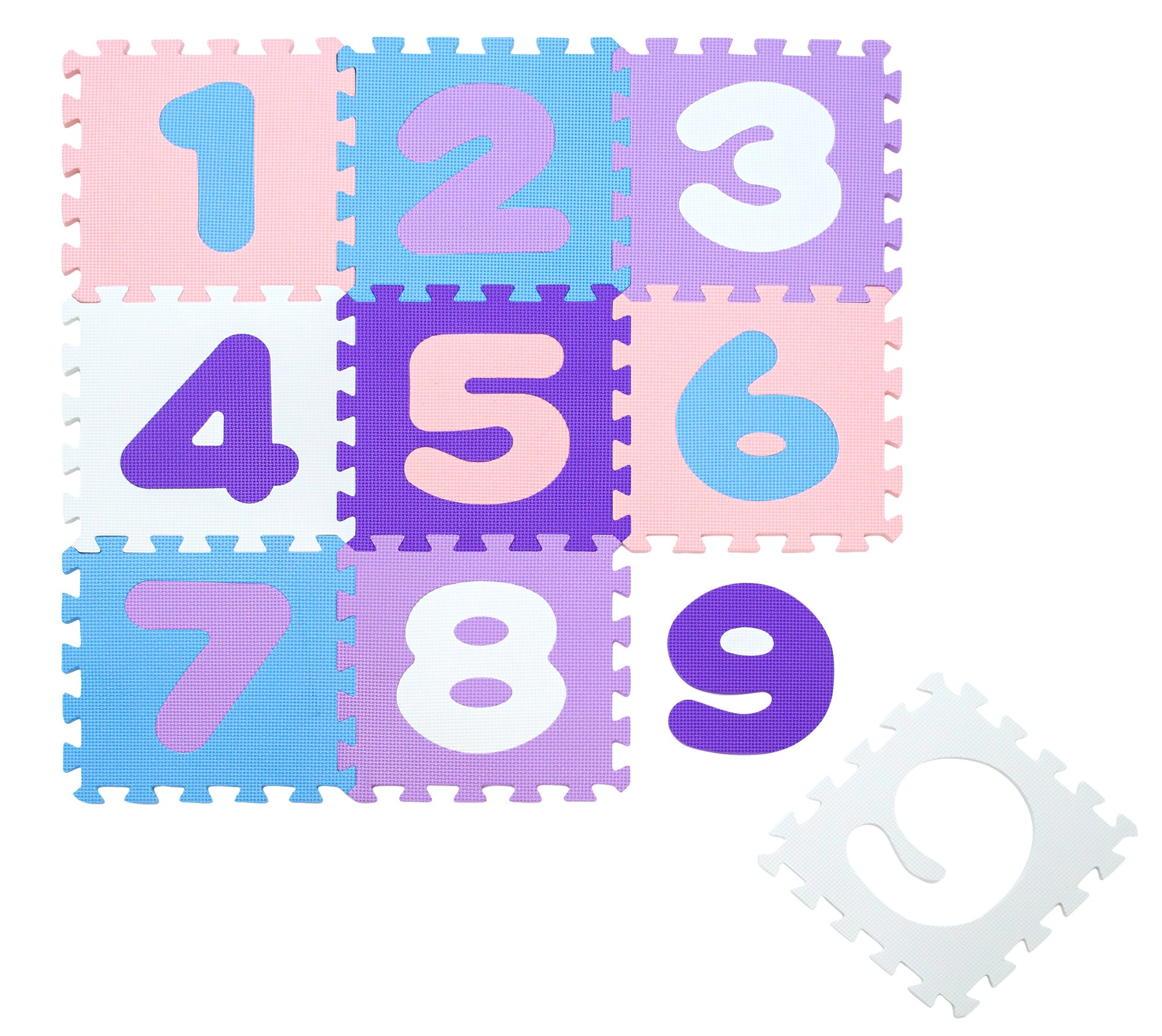 Vsak kos ima izjemljiv element – številko 1–9. Otroci tako vadijo prepoznavanje števil, koordinacijo in prostorsko razmišljanje. Kose je možno povezovati plosko ali v 3D oblike (npr. kocka). Material EVA je brez ftalatov, formamida, BPA in PVC, odlično izolira mraz od tal in duši udarce.