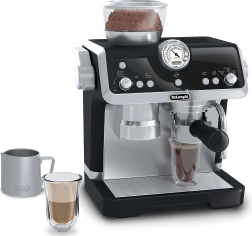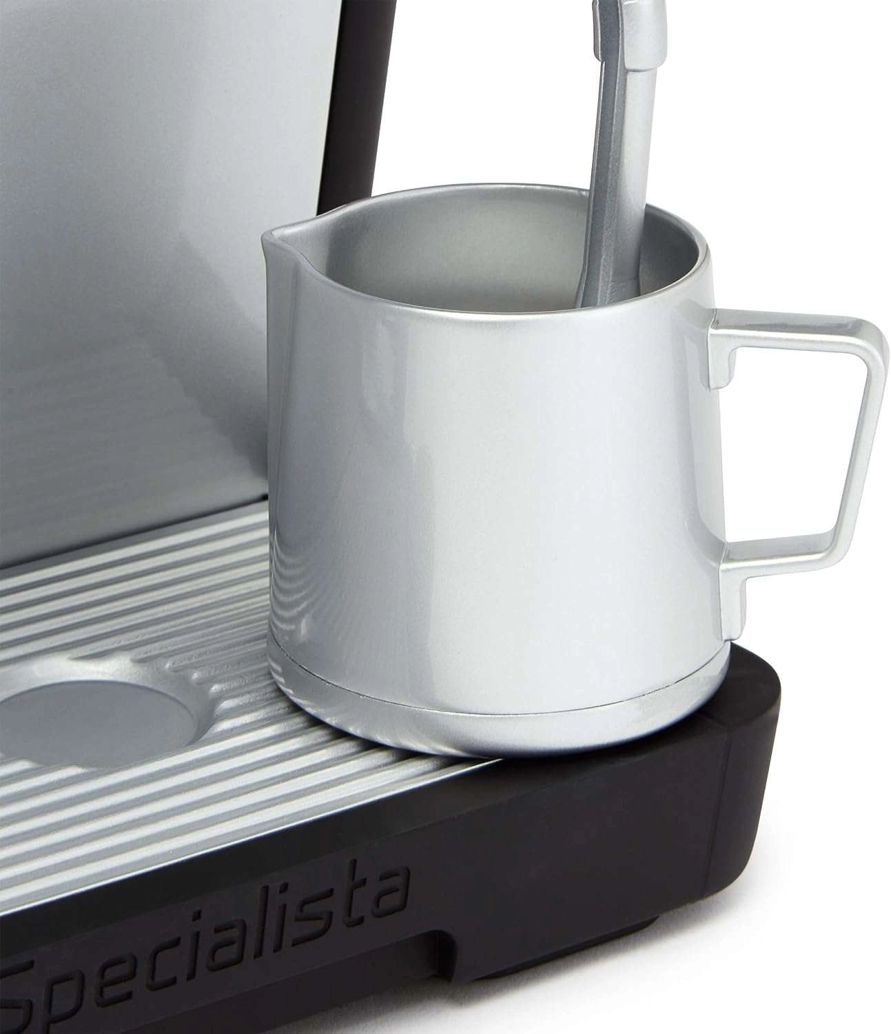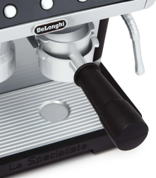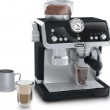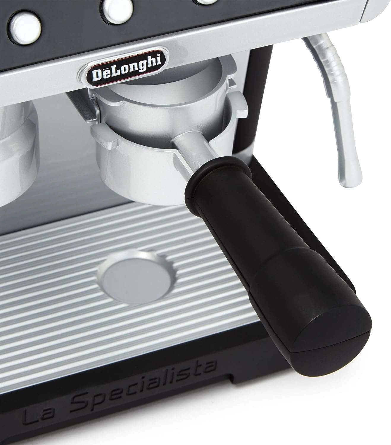 Zgornji zalogovnik za »zrna«, gibljiva ročica in gumbi posnemajo pravi postopek priprave kave – vključno z zvoki mletja in pretakanja.