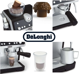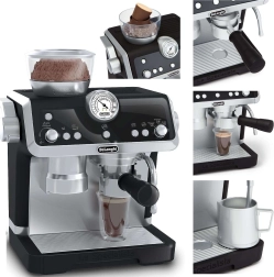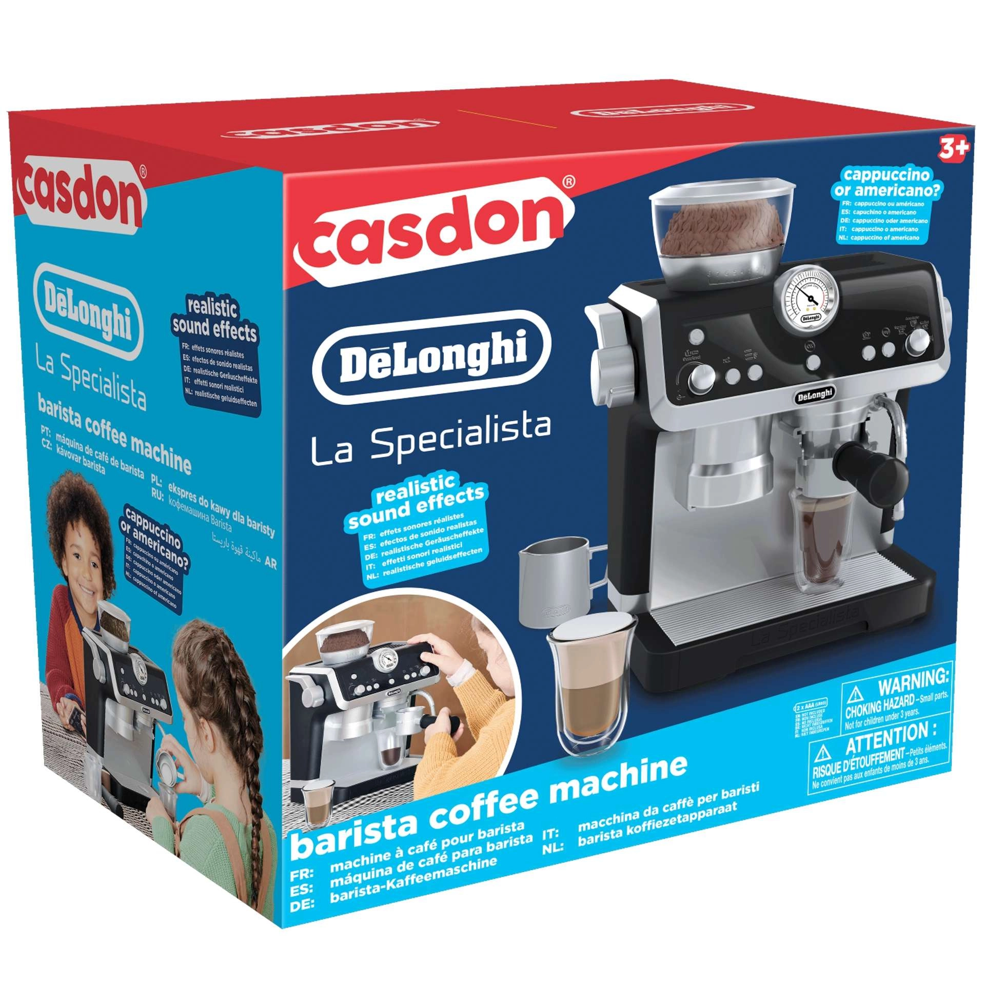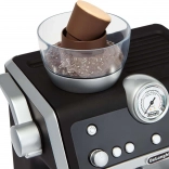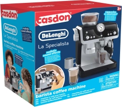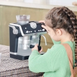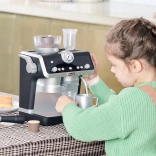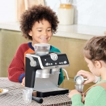 Ta moderen otroški kavni aparat v elegantni črno-beli kombinaciji zvesto posnema pravi ročni espresso aparat. Otroci lahko »zmeljejo« zrna v zgornjem zalogovniku, zaskočijo ročico (portafilter), pritisnejo gumbe in opazujejo, kako »kava« teče v kozarce. Za ljubitelje cappuccina je tu parna šoba z realističnimi zvoki spenjanja »mleka«.