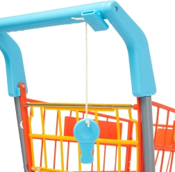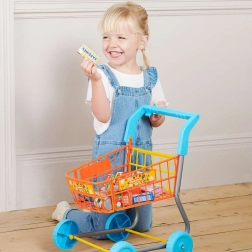 Ta otroški nakupovalni voziček je odlična izbira za male prodajalce in kupce. Zaradi kombinacije oranžnega koška, modrega ročaja in koles ter rumenih detajlov deluje privlačno in spodbuja kreativno igro. Široka kolesa zagotavljajo stabilnost in enostavno manevriranje v notranjih prostorih.