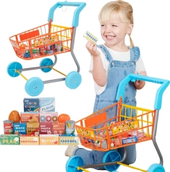 V paketu je 16 realistično natisnjenih škatlic in pločevink z živili ter plastično sadje/zelenjava, kar otrokom pomaga vaditi razvrščanje, štetje in socialne veščine pri igri trgovine. Ob ročaju je obešena majhna piščalka/žeton za še bolj avtentično izkušnjo nakupovanja.