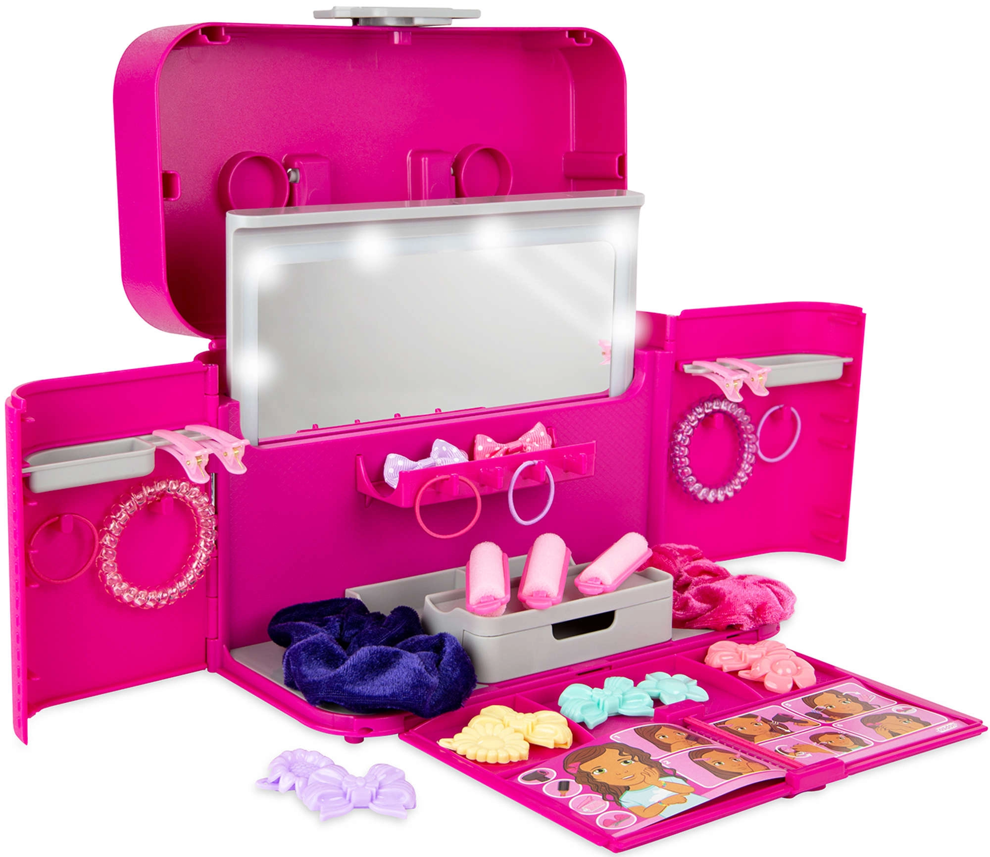Vgrajena lučka okoli ogledala doda igri pristnost in pomaga otrokom, da se pri ustvarjanju pričesk osredotočijo na podrobnosti.