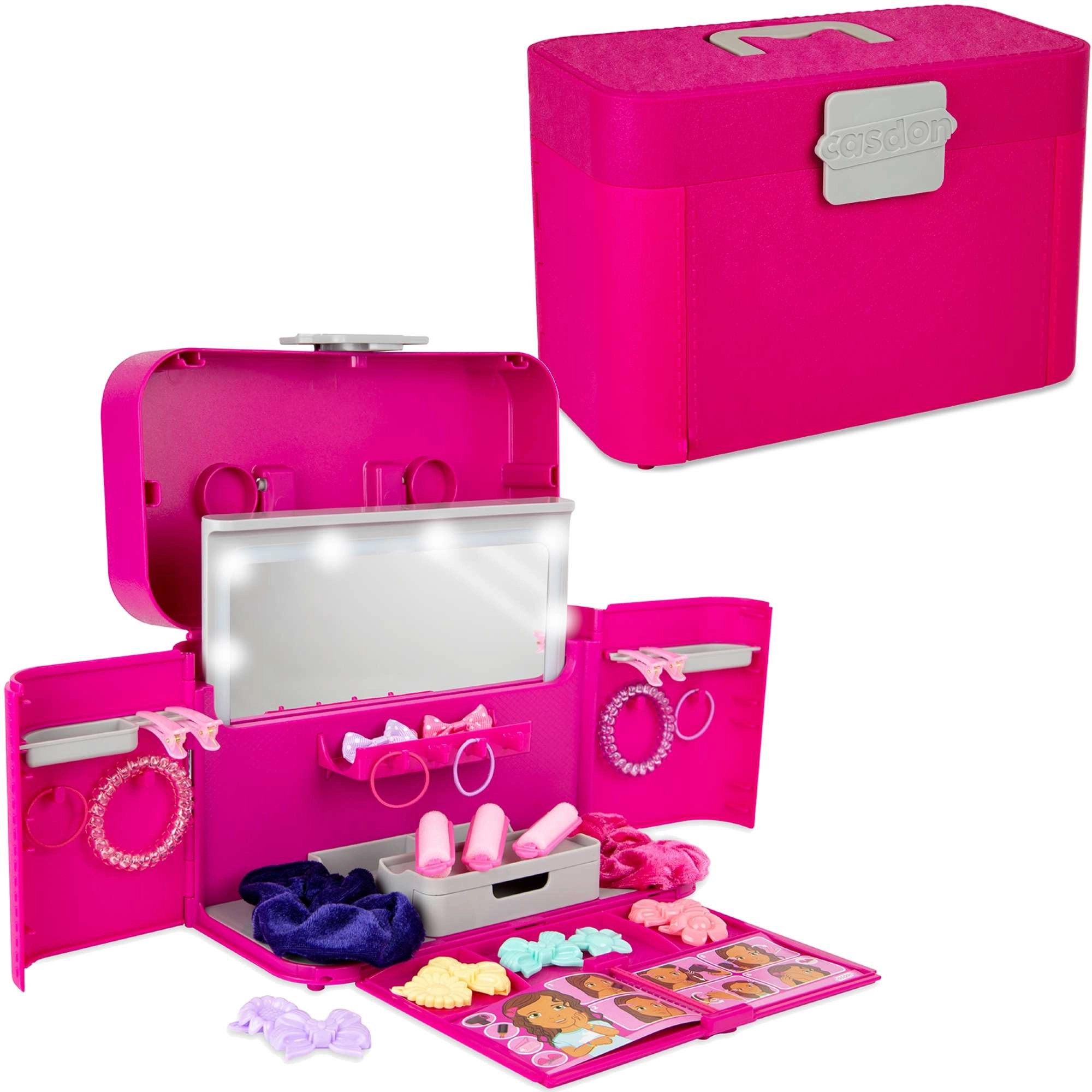 Odkrijte čarobni frizerski studio za otroke: prenosni kovček, ki se po odprtju spremeni v mini toaletko z osvetljenim ogledalcem. Set je zasnovala znamka Casdon pod licenco DYSON in navdihuje k uram domiselne igre, posnemanja salona ter nege las.