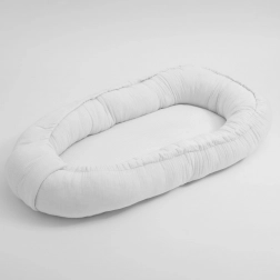 Mehko muslinsko gnezdece New Baby v beli barvi dojenčku nudi varno in udobno zavetje doma in na poti. Zahvaljujoč mehkim robovom in zračnemu bombažnemu materialu se malček počuti mirno in varno, zato lahko bolje spi, počiva in se igra. Odlično za postavitev v posteljico, na kavč, na tla ali v voziček.