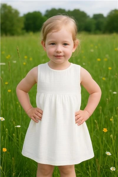 Obleka New Baby Elizabeth je zasnovana za največje udobje in stil v toplih dneh. Muslin sodi med najbolj nežne in zračne tkanine – odlično diha, zmanjšuje tveganje pregrevanja in je izjemno prijeten na dotik. Zaradi A-kroja se obleka lepo vali in ne omejuje gibanja.
