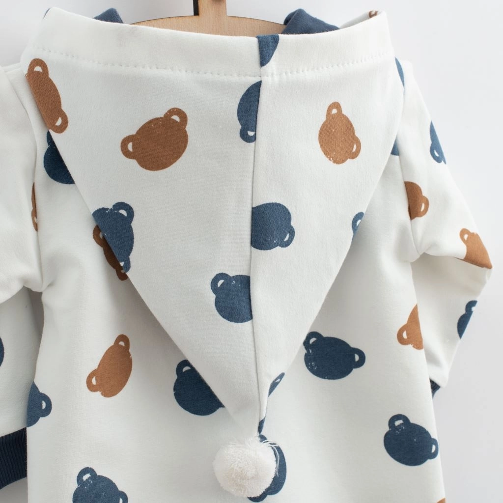 Pajac je po celotni površini potiskan z medvedki in dopolnjen z elastičnimi obrobami na rokavih in hlačnicah, ki držijo obliko in ščitijo pred mrazom. Odlična izbira za doma, sprehode in voziček – vsestranski kos za vse leto.