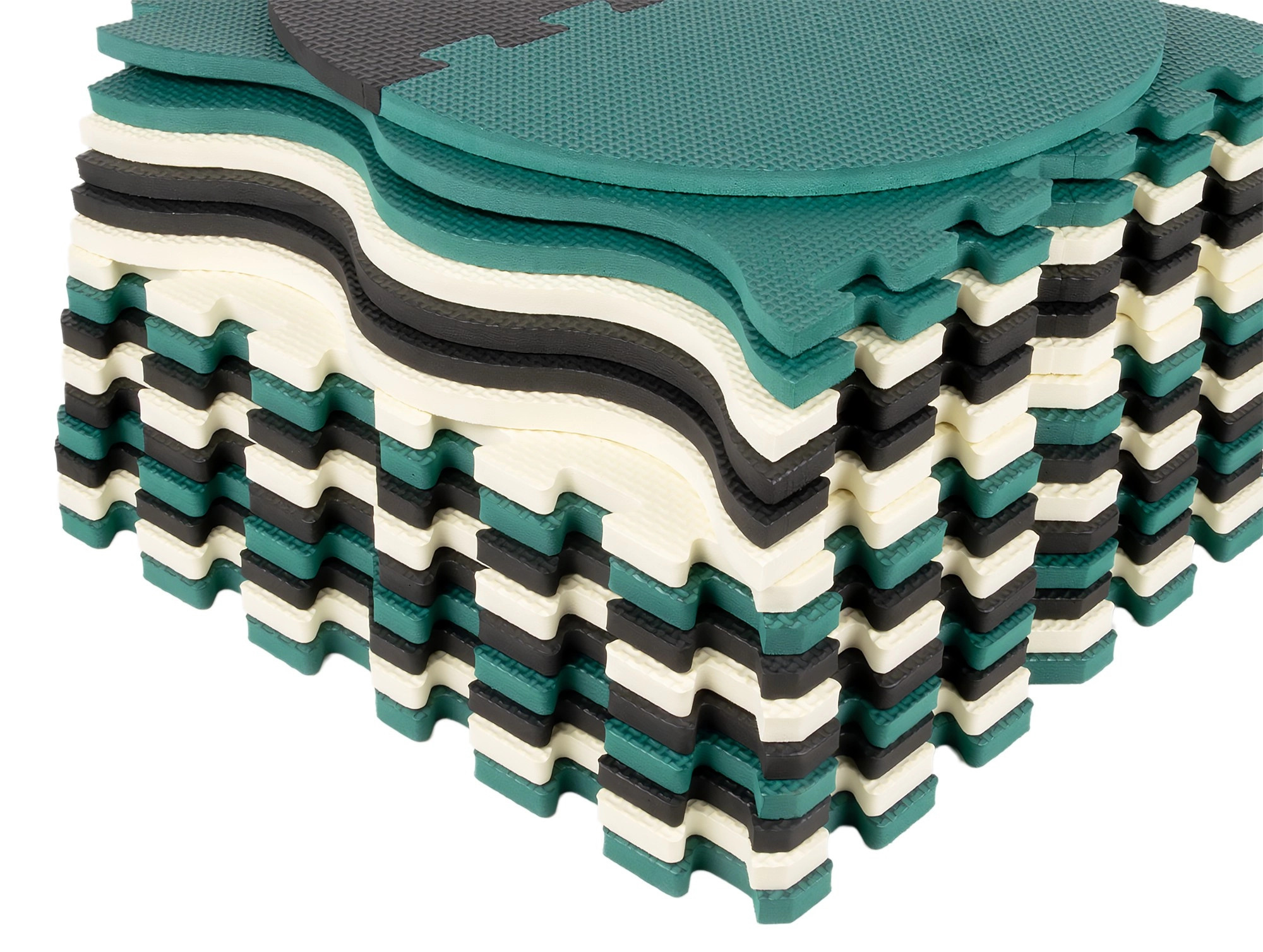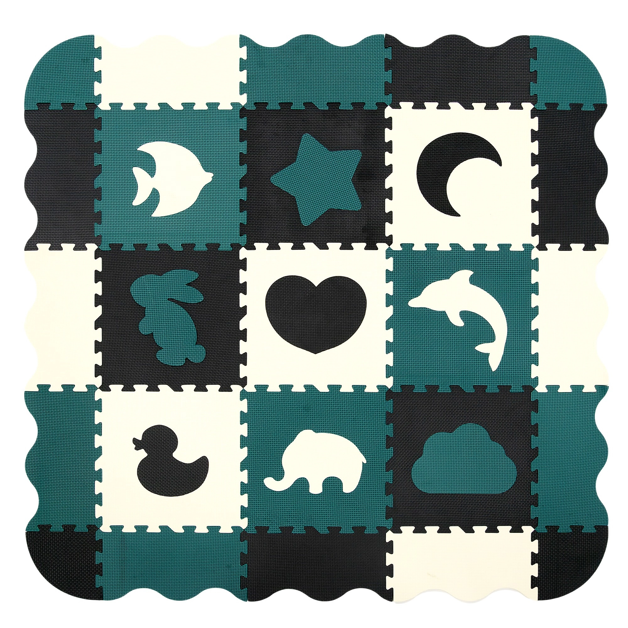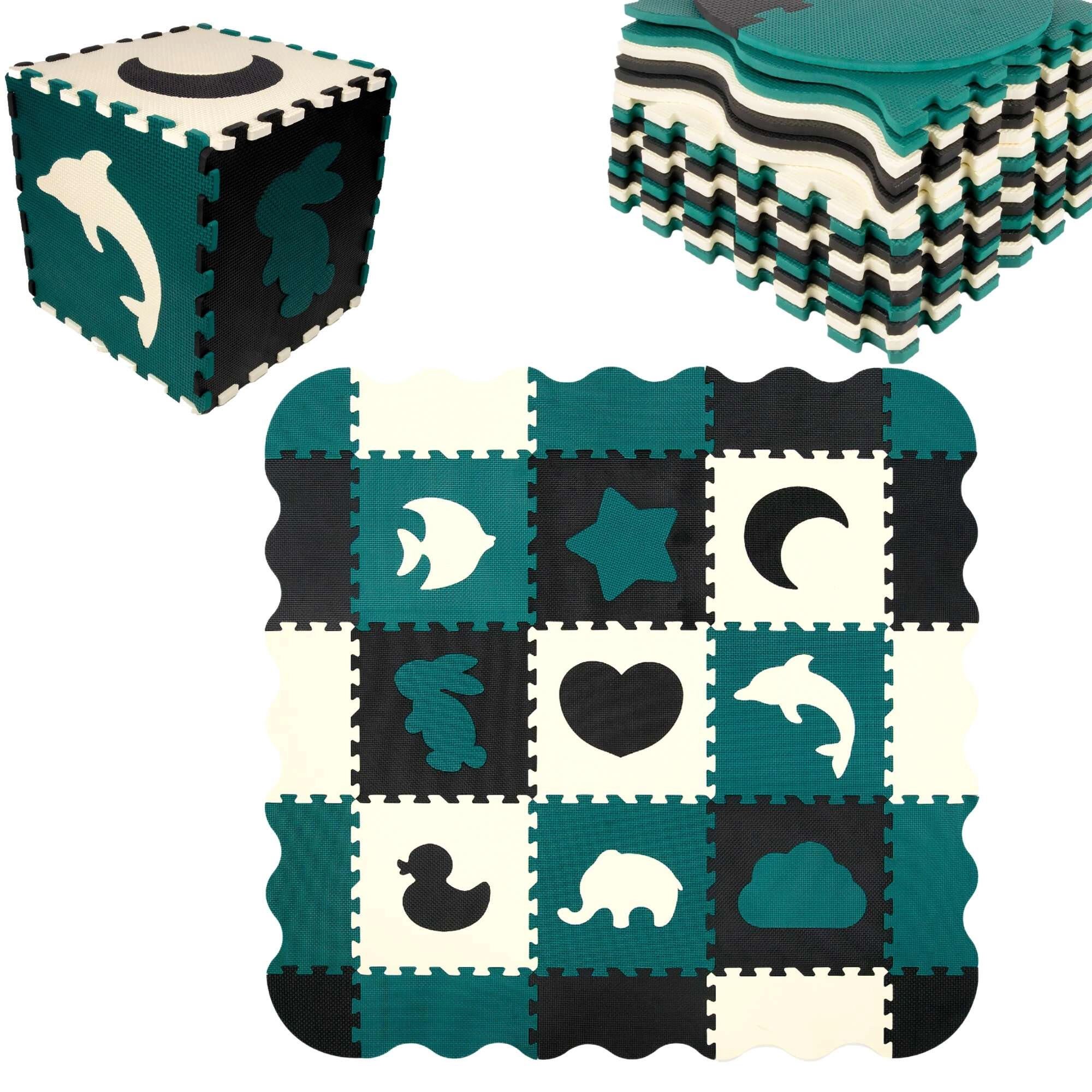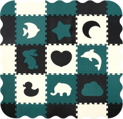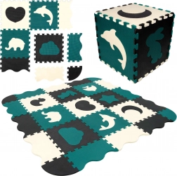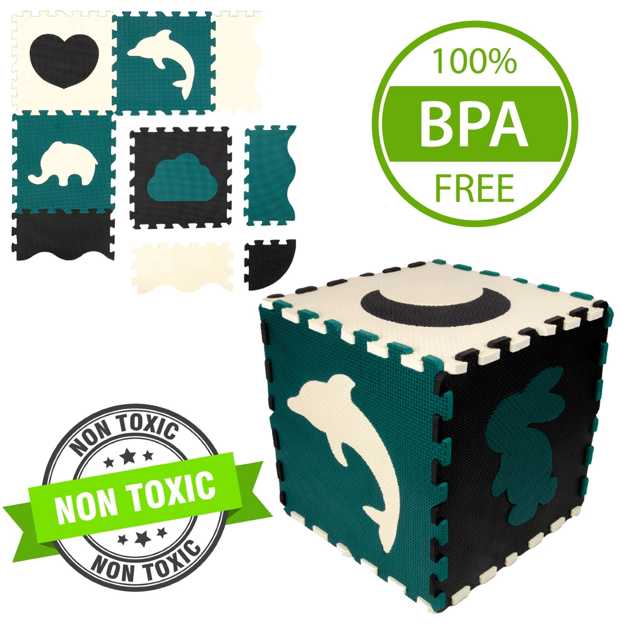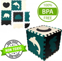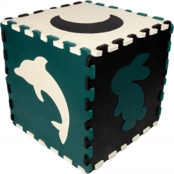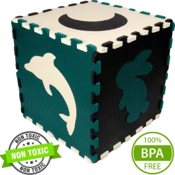 Elementi služijo tudi kot 3D sestavljanka – odstranljive motive živali in oblik lahko povezujete in sestavljate v prostorske objekte (npr. kocko), s čimer otrok razvija prostorsko predstavo, prijem in koordinacijo. Material EVA je brez ftalatov, formamida, BPA in PVC, izpolnjuje EN 71 in REACH ter nosi oznako CE.