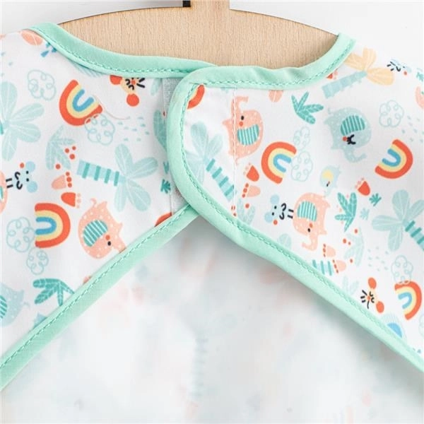 Zapiranje na ježka omogoča hitro oblačenje in slačenje, medtem ko mehak sprednji žep ujame drobtine in kapljice. Predpasnik je primeren za hranjenje, samostojno prehranjevanje in ustvarjalne dejavnosti. Moderni vzorci in zelena barva razveselijo otroke in starše.