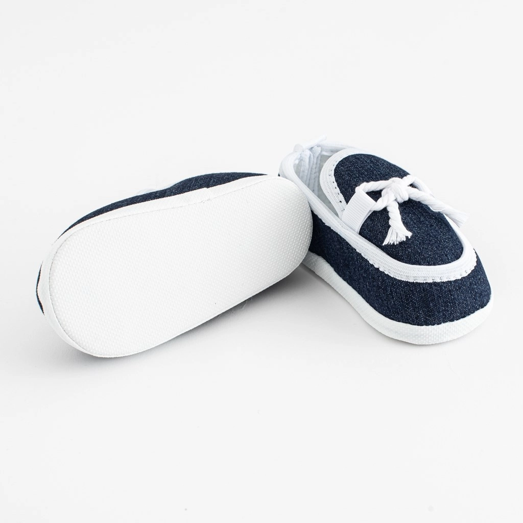 Ti temno modri copatki v elegantnem mokasinskem slogu ponujajo dojenčku udobje in podporo naravnemu razvoju stopal. Zaradi širšega notranjega dela imajo prsti dovolj prostora, hkrati pa se čeveljčki lepo prilegajo stopalu in dobro držijo. Lahka zasnova s tankim podplatom pomaga pri zaznavanju podlage in je primerna za prve igre in plazenje.