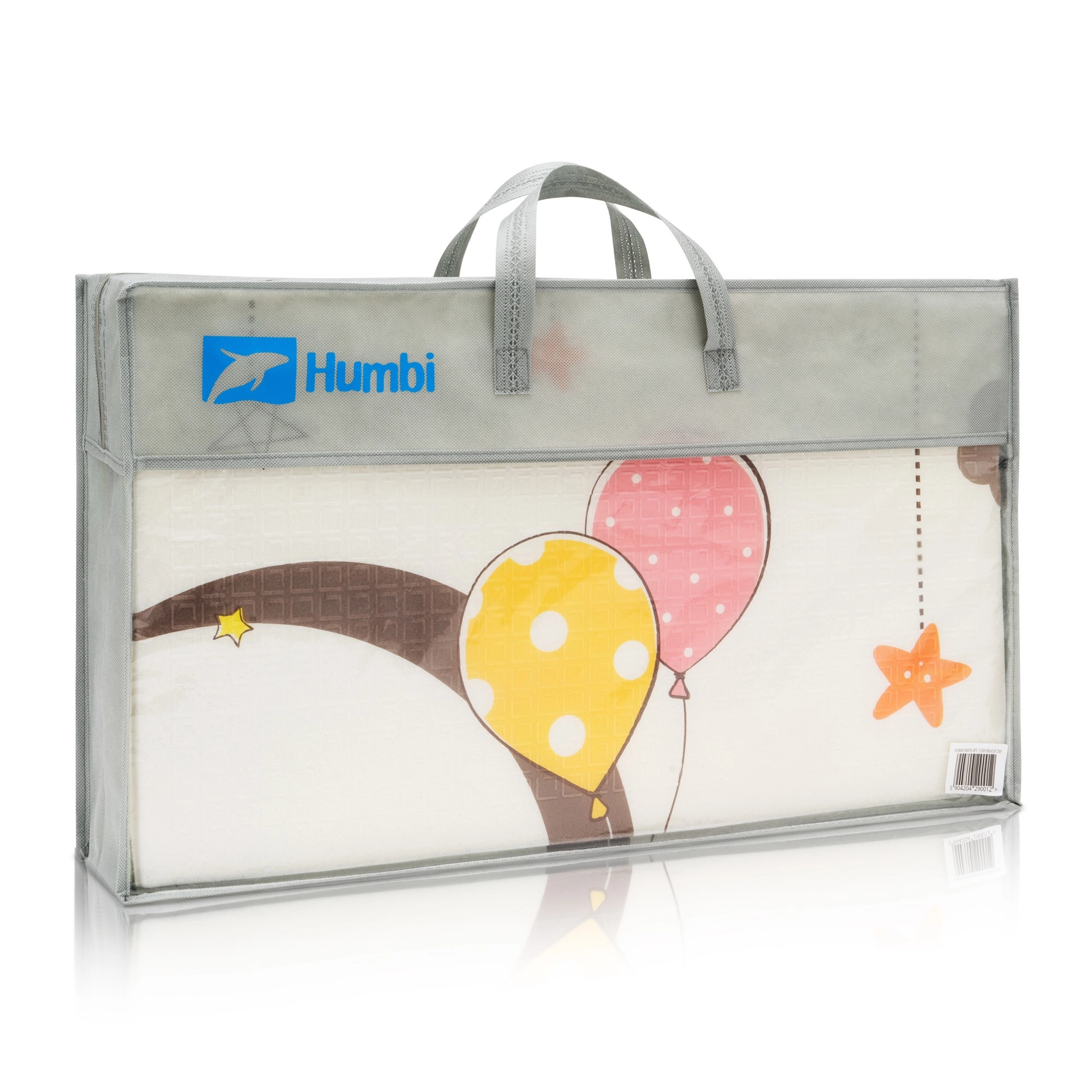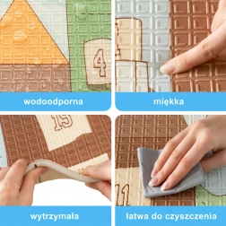Velikoformatna igralna podloga HUMBI iz premium pene XPE ustvarja udoben in higienski prostor za dojenčke in večje otroke. Zaradi debeline 0,8 cm odlično duši udarce, izolira pred mrazom, njen nežno reliefen, nedrseč površinski sloj pa podpira varno učenje plazenja in hoje. Z dvostranskim dizajnom s simpatičnimi motivi živalic, hišic in številk zlahka poživi vsako otroško sobo ali dnevni prostor.
