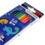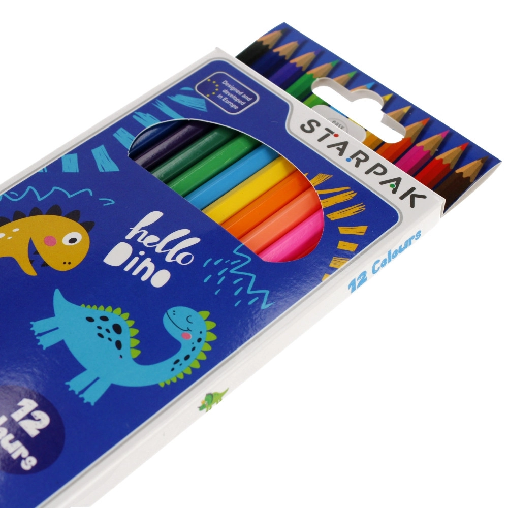 Ta set vsebuje 12 kakovostnih barvic z priljubljenim motivom dinozavrov. Vsaka barvica je dolga 18 cm, šesterokotna oblika pa zagotavlja dober oprijem, ne drsi iz roke in se manj kotalí po mizi. Ostra mina zagotavlja natančne linije in živahno barvanje.