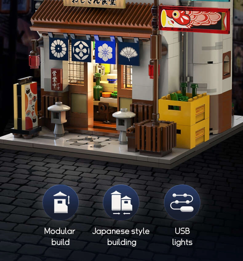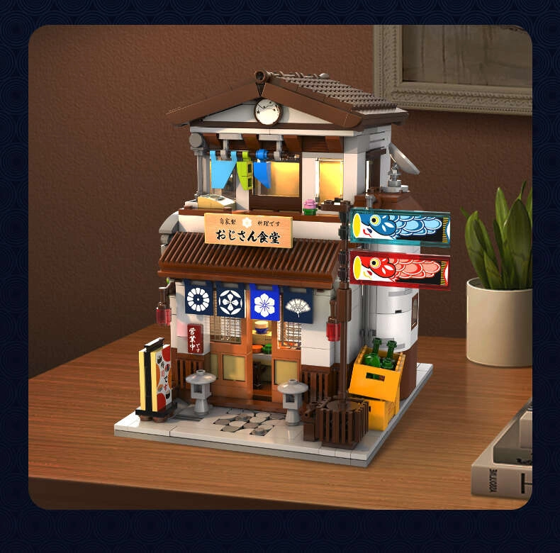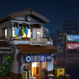 Ta dovršena stavbnica predstavlja tradicionalno japonsko hišo s kuhinjo v pritličju in bivalnim delom v nadstropju. Zahvaljujoč odstranljivi strehi ali možnosti premika stene lahko zlahka pokukate v notranjost in uživate v vseh drobnih podrobnostih. Vgrajena LED luč pričara večerno vzdušje ulic Tokia in modelu doda edinstven pridih.