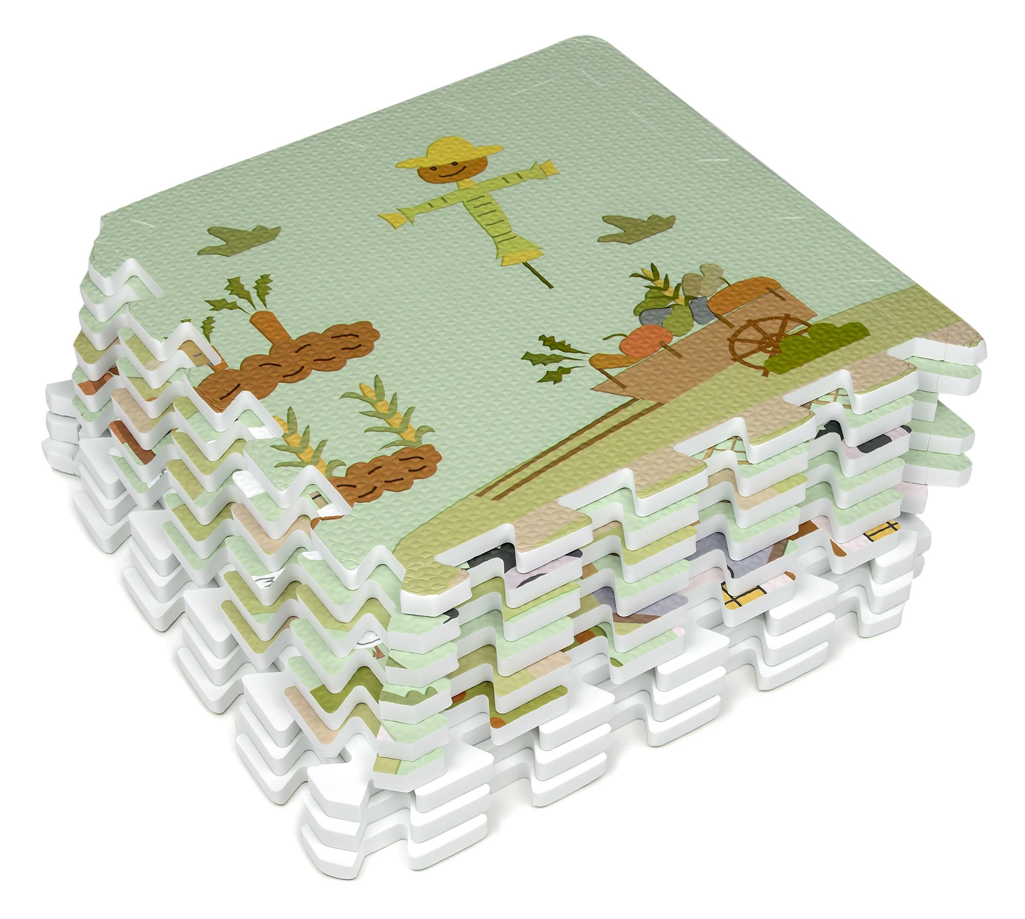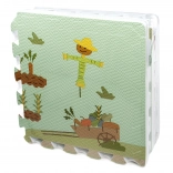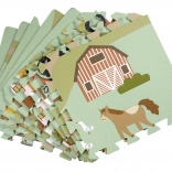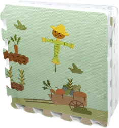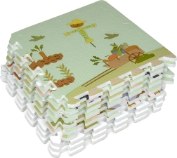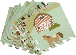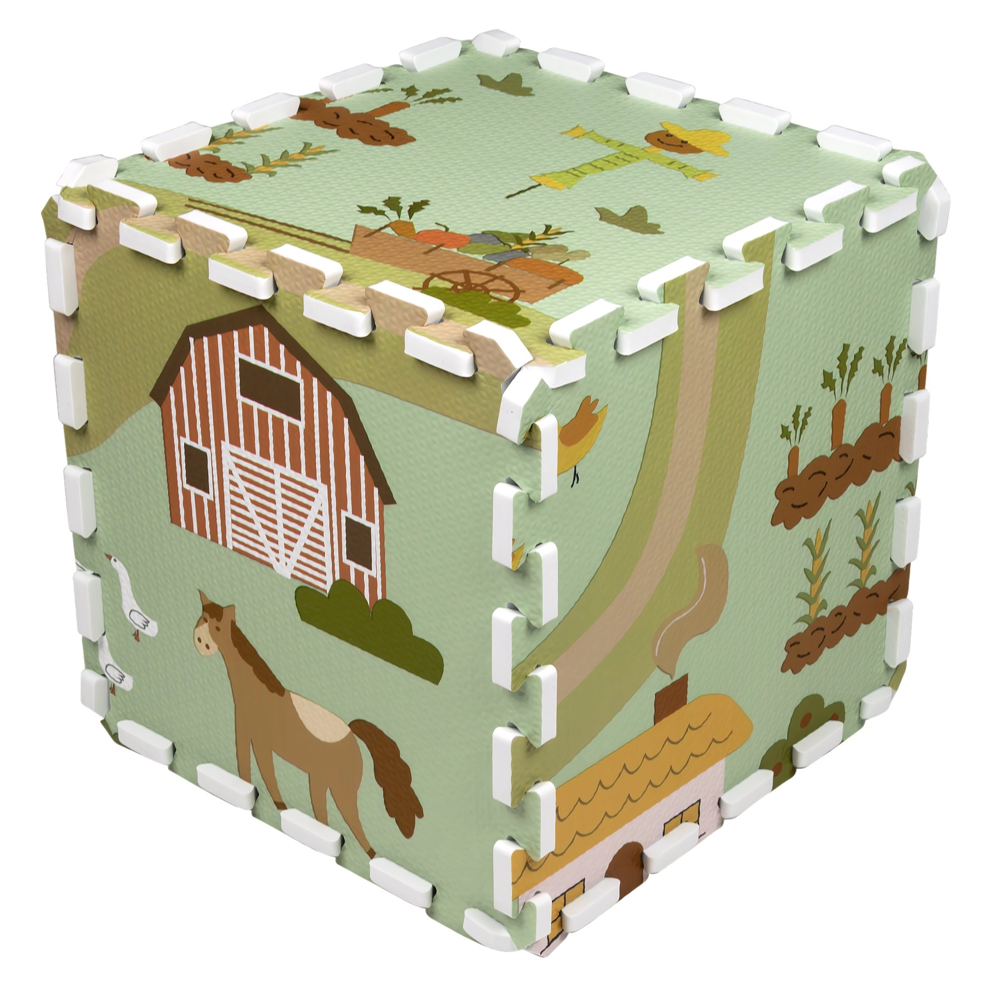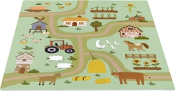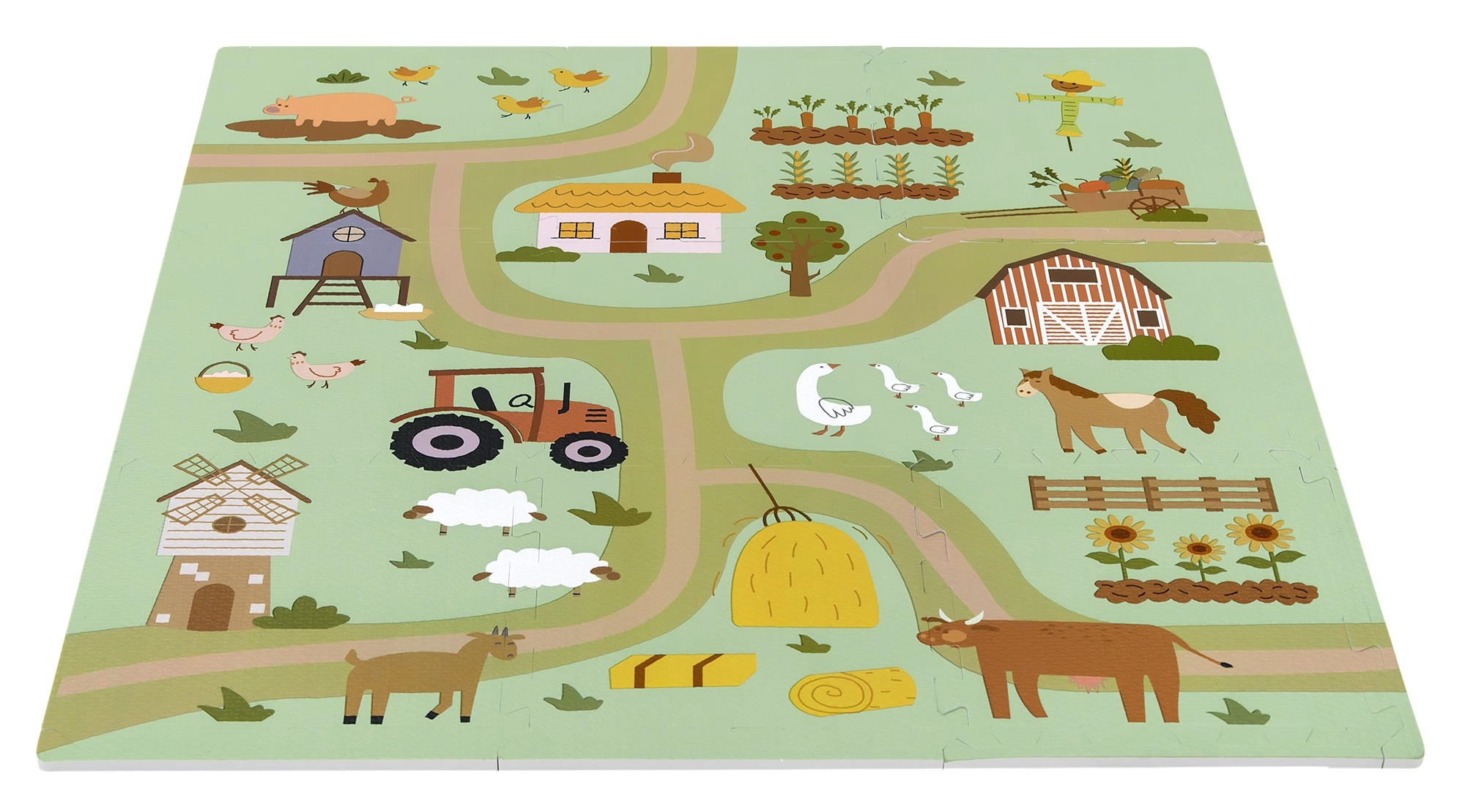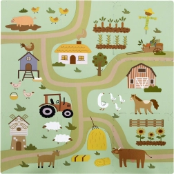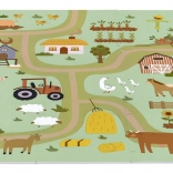 Deli 30 × 30 cm se natančno prilegajo, zato jih zlahka povežete v večjo površino ali ustvarite prostorske oblike, na primer kocko. Bogat motiv podeželskih cest, traktorja, skednja in živalic spodbuja domišljijo in odlično služi kot steza za avtomobilčke ter kulisa za figurice.