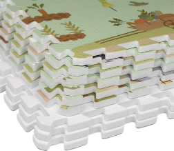 1 cm debela EVA pena s protizdrsno strukturo zagotavlja mehko pristajalno površino, odlično izolira od hladnih tal in podpira varno plazenje ter hojo.