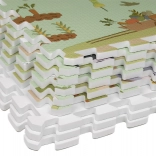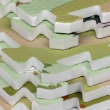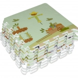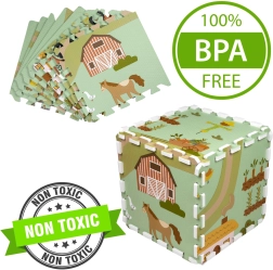Podloga je iz prožne EVA pene, brez ftalatov, formamida, BPA in PVC, izpolnjuje standarde EN 71 in REACH ter nosi oznako CE. Je vodoodporna, higienska, enostavna za čiščenje – dovolj je obris z vlažno krpo – in zahvaljujoč robovom ustvari čist in estetski površinski zaključek.
