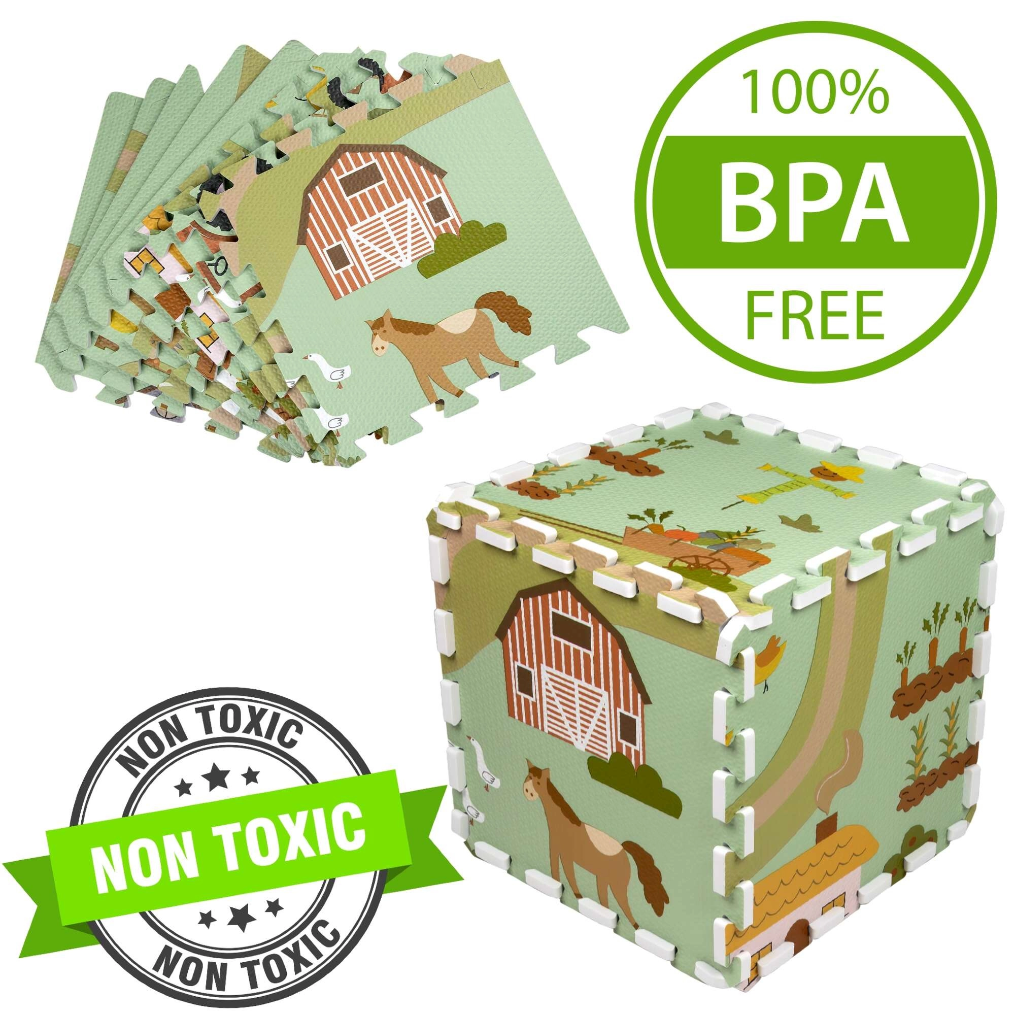 Odkrijte vsestransko penasto podlogo HUMBI z motivom kmetije, ki bo otroško sobo spremenila v varno in spodbudno igrišče. Debela plast pene (1 cm) ščiti pred mrazom tal in hkrati amortizira padce. Teksturirana površina je protizdrsna in idealna za varno učenje plazenja in hoje.