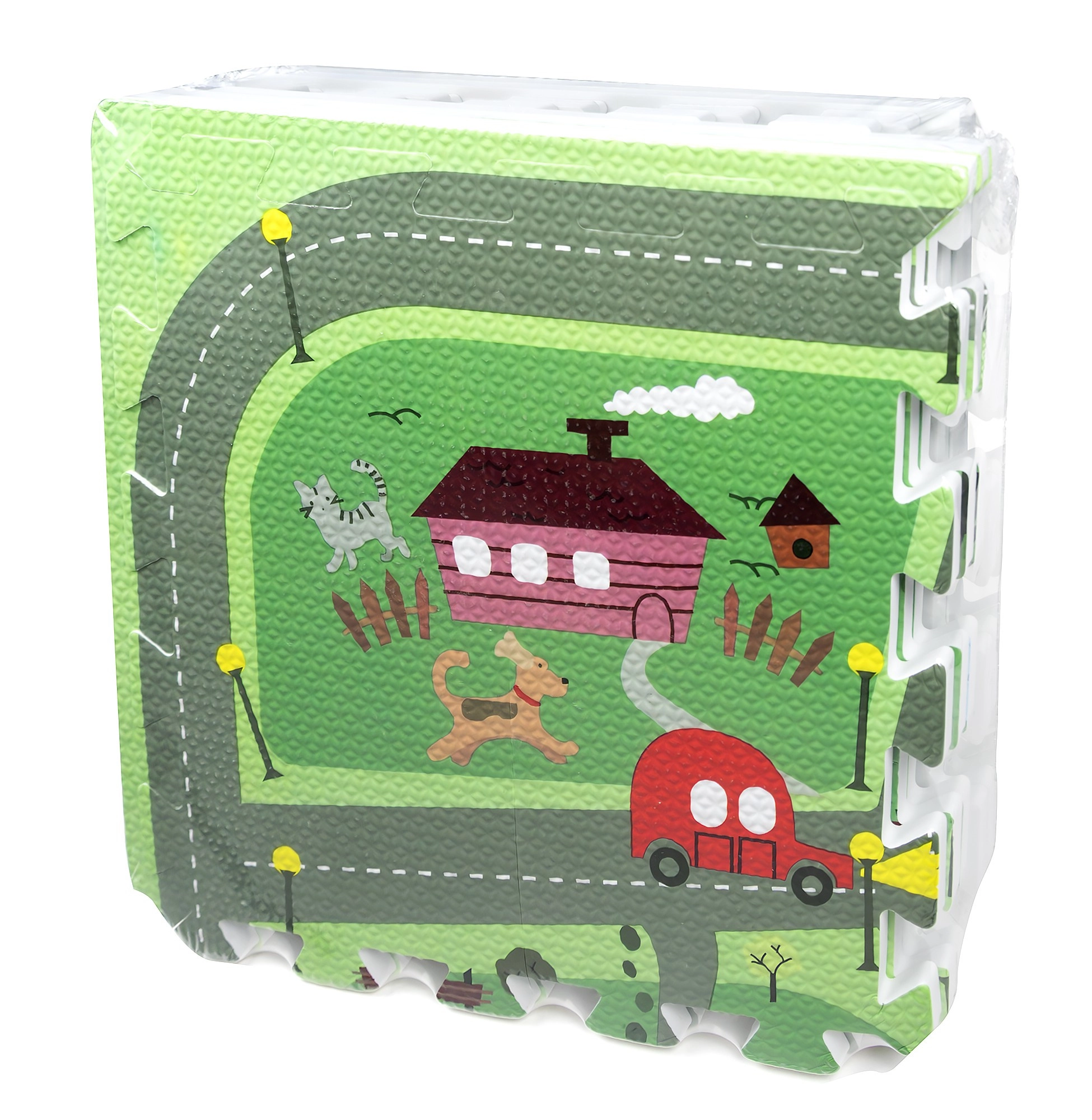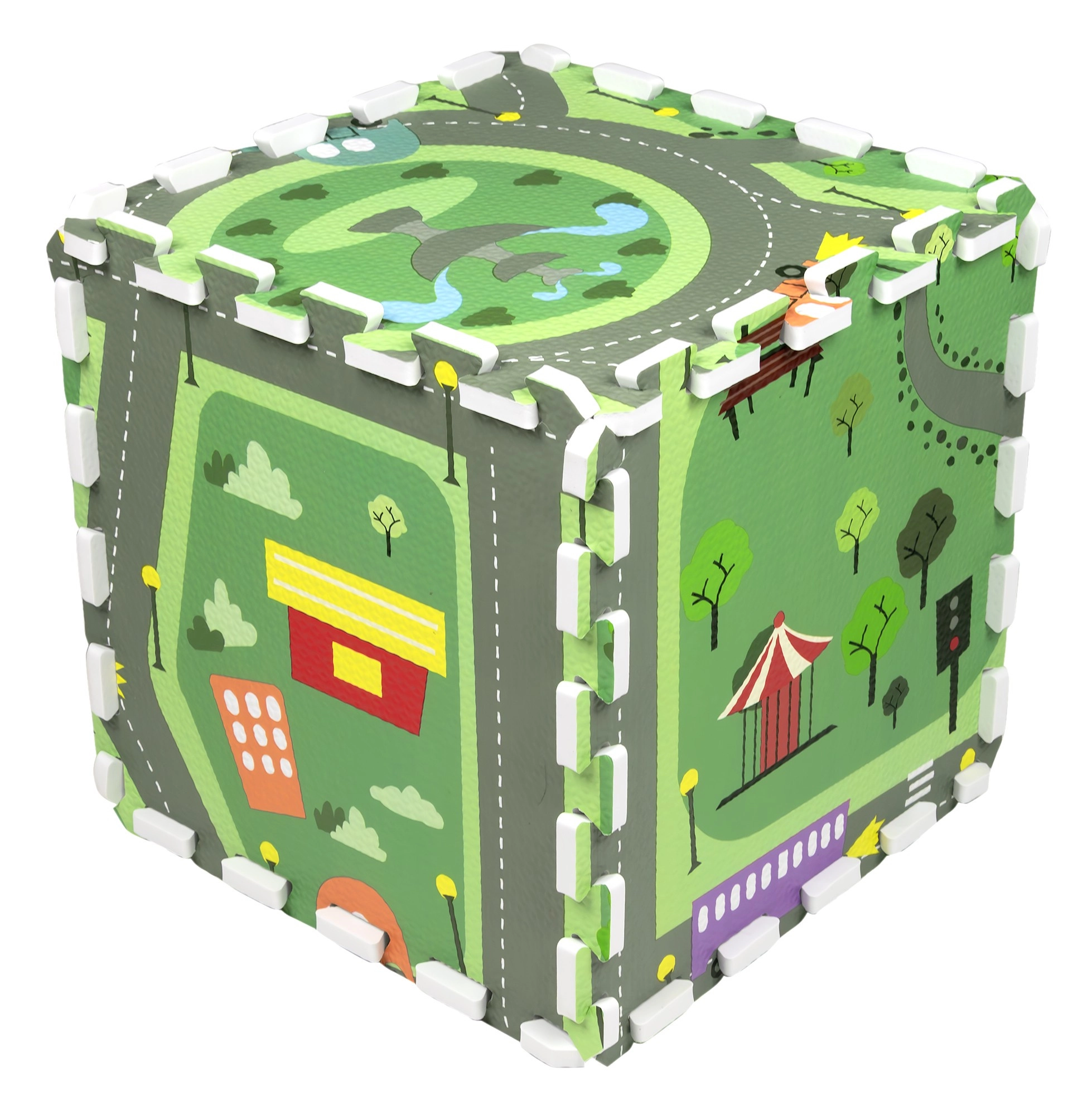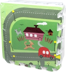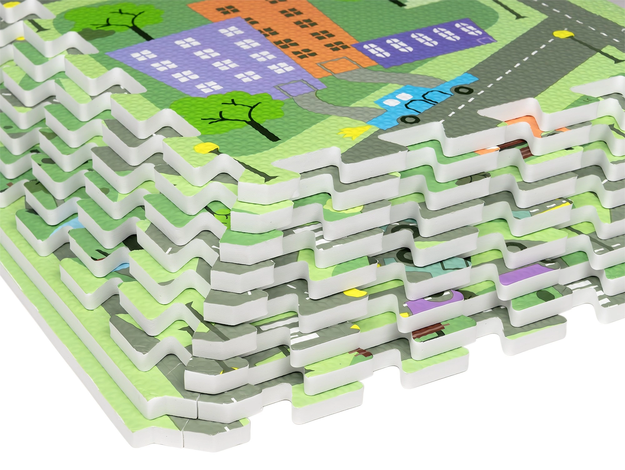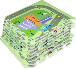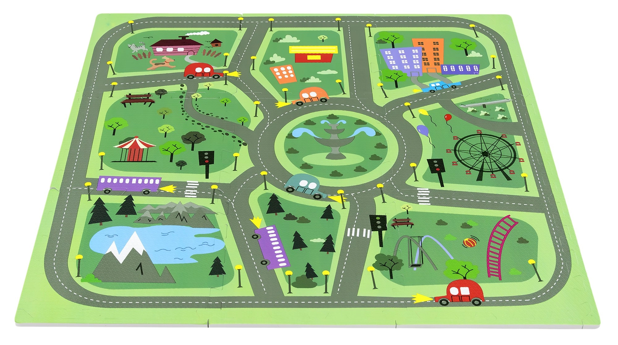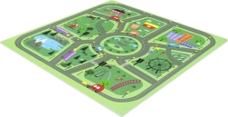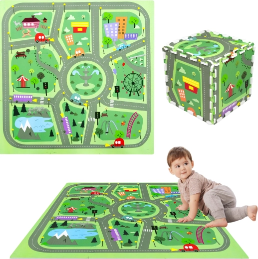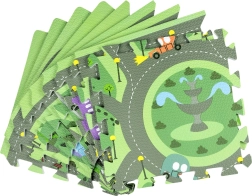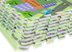 Ustvarite otroku udoben in higienski prostor za igro. Podloga iz prožne EVA pene je brez ftalatov, formamida, PVC in BPA, ima protizdrsno površino in nežne reliefne strukture za bolj samozavestne prve korake. Pastelni motiv mestnih ulic s krožiščem, parki, jezercem in stavbami spodbuja domišljijo ter vabi k vožnji avtomobilčkov in ustvarjalni igri s figuricami.