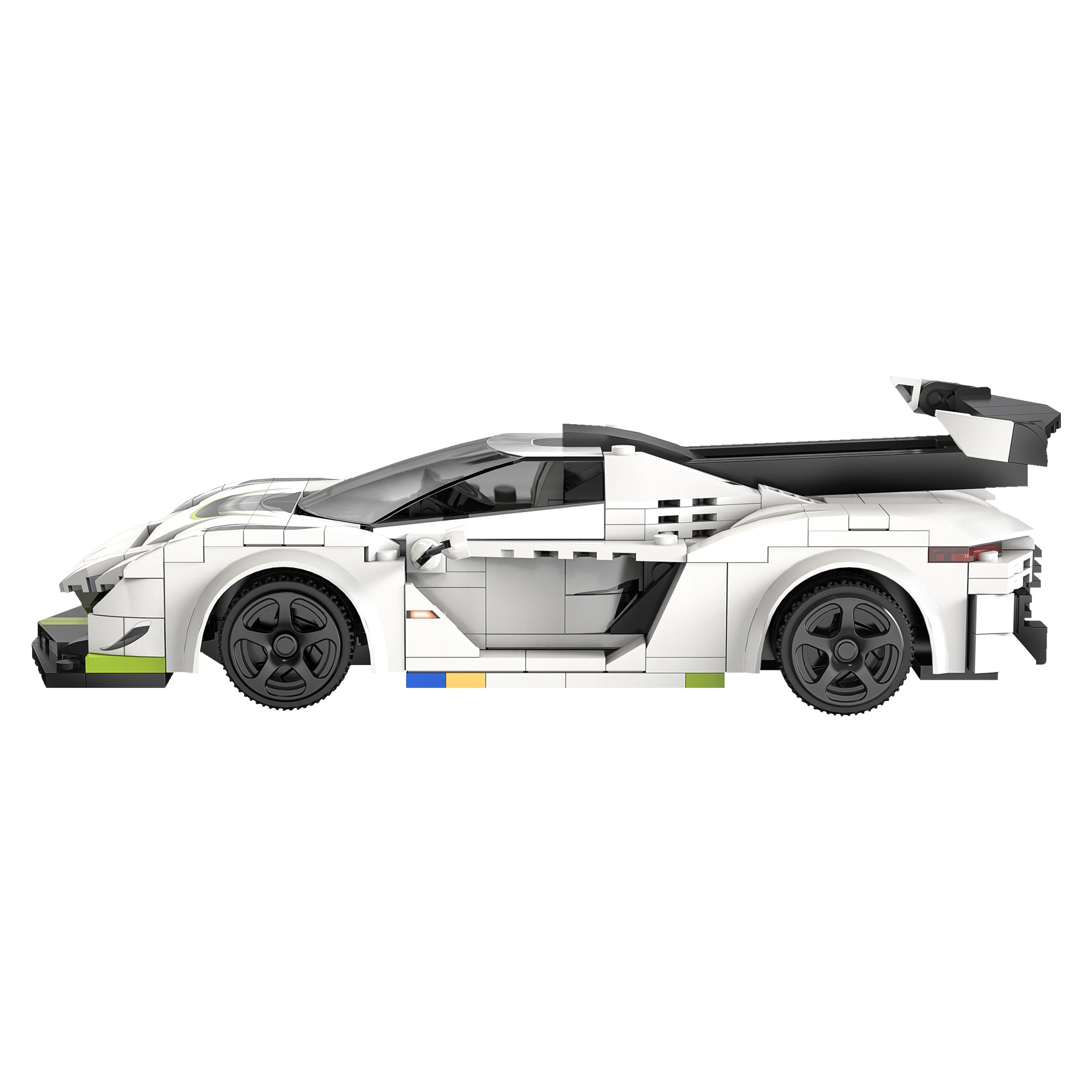 Bela karoserija s črnimi in limetno zelenimi poudarki, veliko zadnje krilo in dovršeni paneli dajejo modelu avtentičen videz superavta tako na polici kot na stezi.