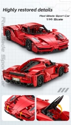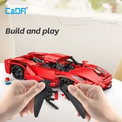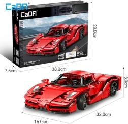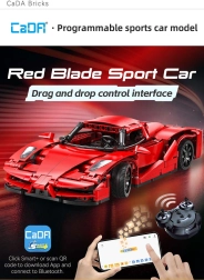 Vstopite v svet tehničnih gradbenih setov z modelom CaDA Red Blade – podrobno izdelanim športnim avtom z daljinskim upravljanjem. Rdeča karoserija s črnimi poudarki, realistična razmerja in premični deli bodo navdušili male in velike navdušence. Vozilo upravljajte s priloženim RC daljincem ali pametnim telefonom prek Bluetootha in uživajte v gladki vožnji po različnih podlagah.