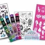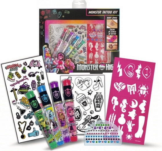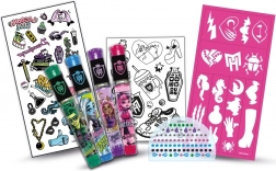 Odkrijte čar sveta MONSTER HIGH in ustvarite izvirne začasne tetovaže, polne sijaja in domišljije. Komplet ponuja 4 gel peresa z bleščicami, metalne nalepilne tetovaže, kristale, okrasne nalepke in šablone za preprosto in natančno okraševanje. Idealno za otroke, ustvarjalne zabave in kot darilo.