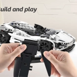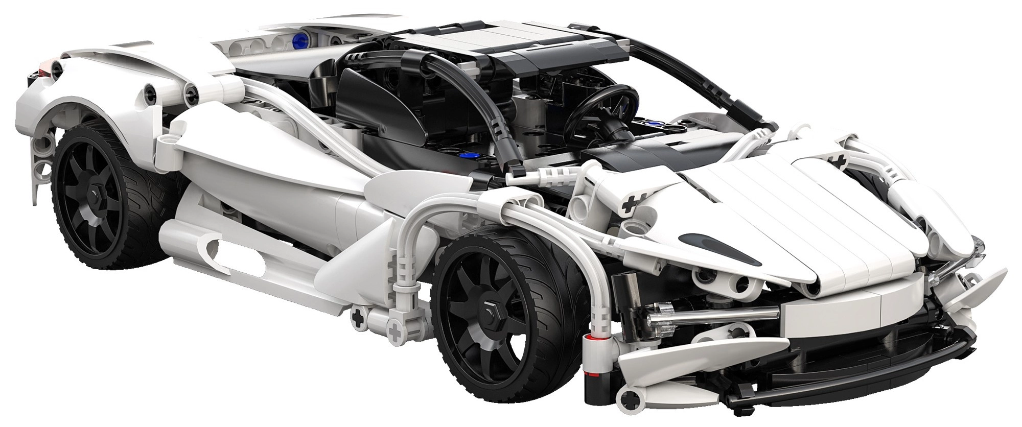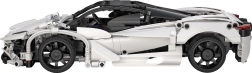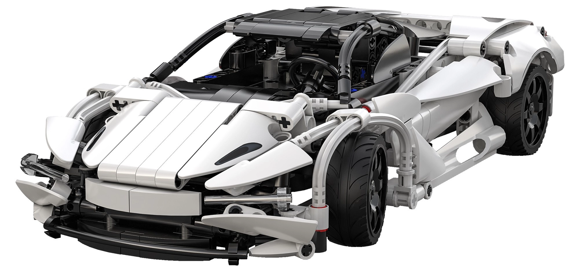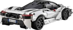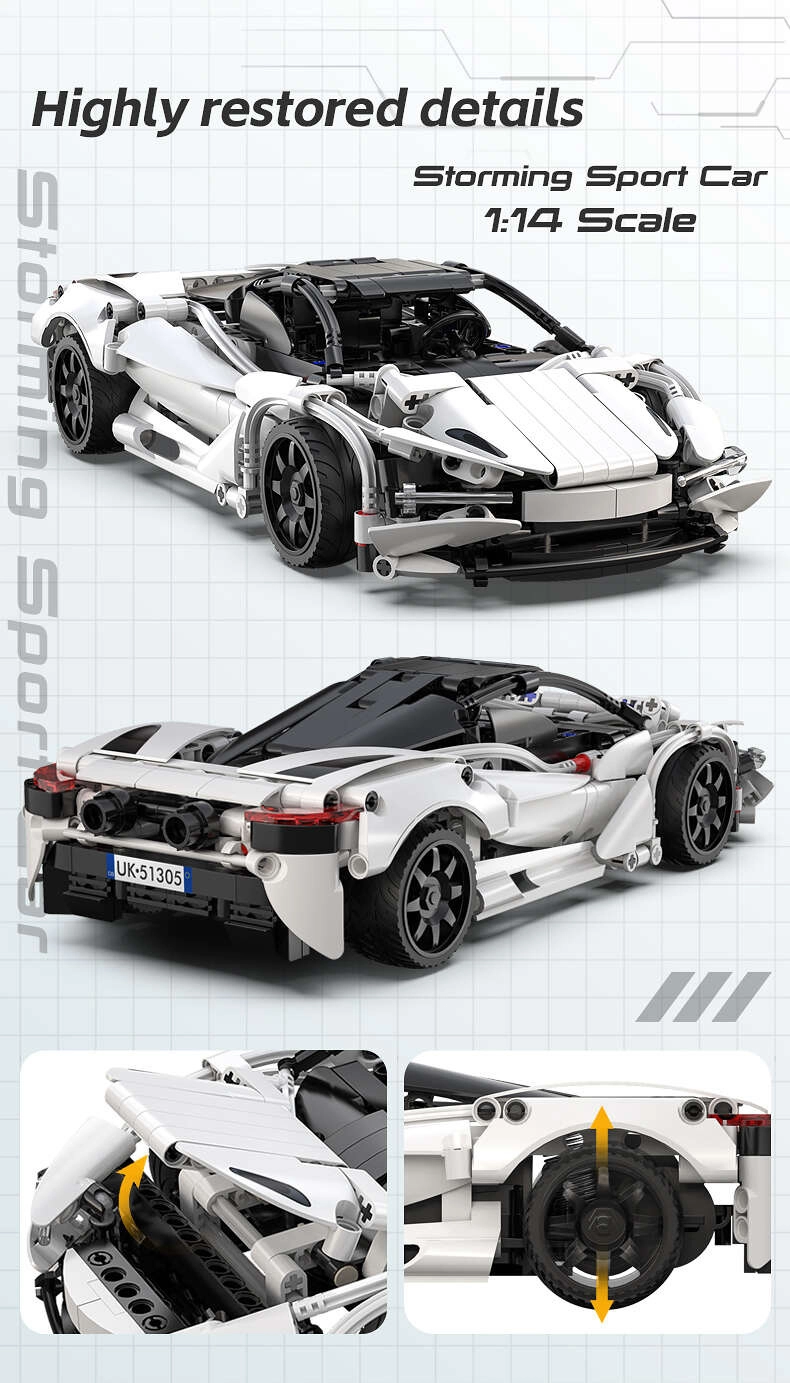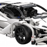 Podrobna bela karoserija s črnimi elementi, odpirajoč se pokrov motorja in gumijasta kolesa za zanesljiv stik s podlago. Odličen videz in funkcionalnost.