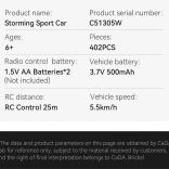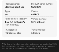 Športni avto CaDA izstopa z realističnimi proporcami, čvrsto konstrukcijo in privlačno belo karoserijo s črnimi poudarki. Zahvaljujoč pogonom in natančnemu krmiljenju boste uživali v gladki vožnji naprej in nazaj ter natančnem zavijanju. Dual Mode omogoča upravljanje modela s klasičnim upravljalnikom ali pametnim telefonom z Bluetooth – zabava doma in na prostem.