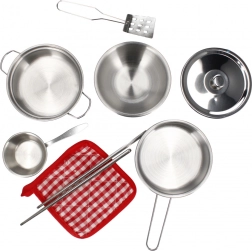Zabaven otroški kuhinjski set za male kuharje od 3 let. Vsebuje lonce s pokrovom, skledo, zajemalko, krpo in palčke za igro kuhanja. Idealno za razvoj domišljije, fine motorike in igre vlog v otroški kuhinji.