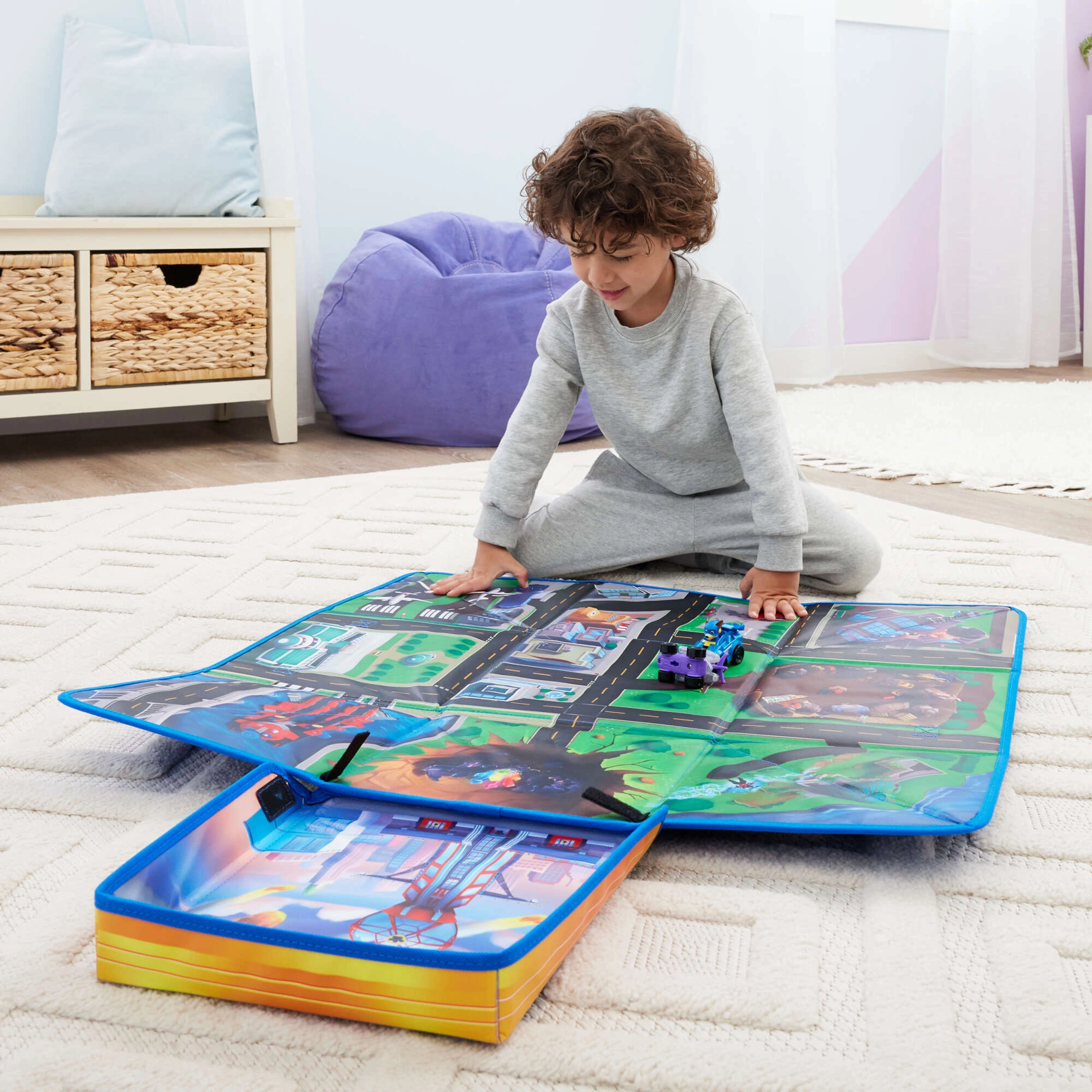 Po igri preprosto zložite podlogo v trdno kocko 25,4 × 25,4 × 25,4 cm. Igrače ostanejo skupaj, soba pa bo pospravljena v hipu.