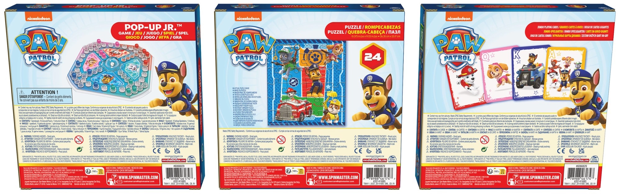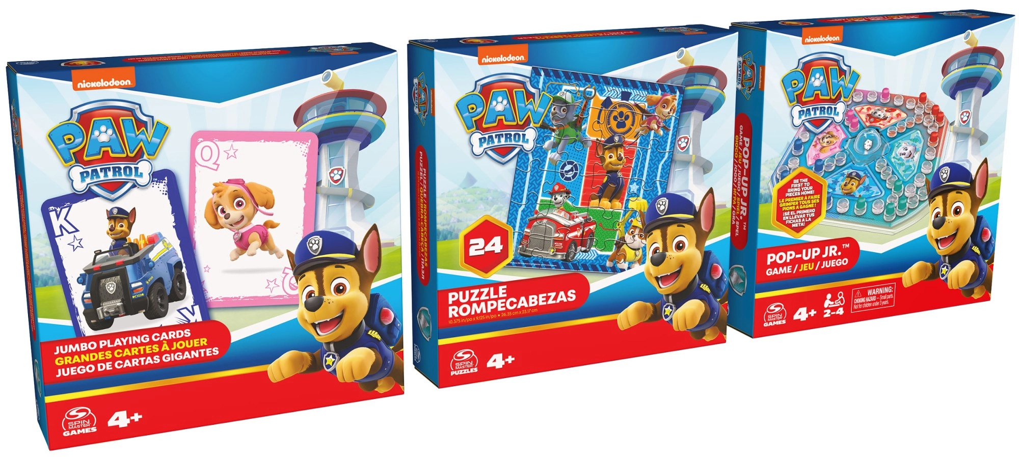 Družabna igra ima plastično igralno ploščo, razdeljeno na štiri cone z utori za figurice in priročno pop-o-matic kocko na sredini za preprosto in zabavno »metanje«. Puzzle po sestavi ustvarijo sliko z mladiči PAW PATROL velikosti 26,35 × 23,17 cm. Jumbo karte so odlične za majhne roke in ponujajo različne igralne različice.