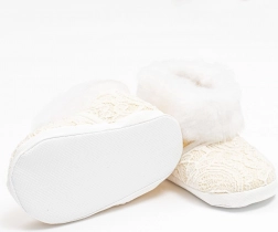 Ti copatki so zelo lahki in imajo tanek sintetičen PVC podplat brez BPA, ki je nežen in primeren za vsakodnevno nošenje v vozičku ali doma. Niso namenjeni hoji, odlično pa grejejo in dopolnijo zimski outfit vašega dojenčka.