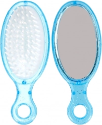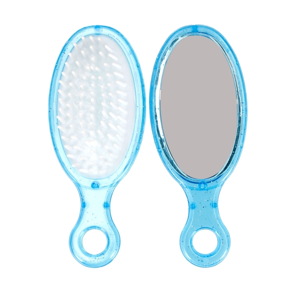 Lahka modra krtača in ujemajoče ročno ogledalce omogočata otrokom česanje, urejanje in preverjanje pričesk pri igri lepotnega salona.