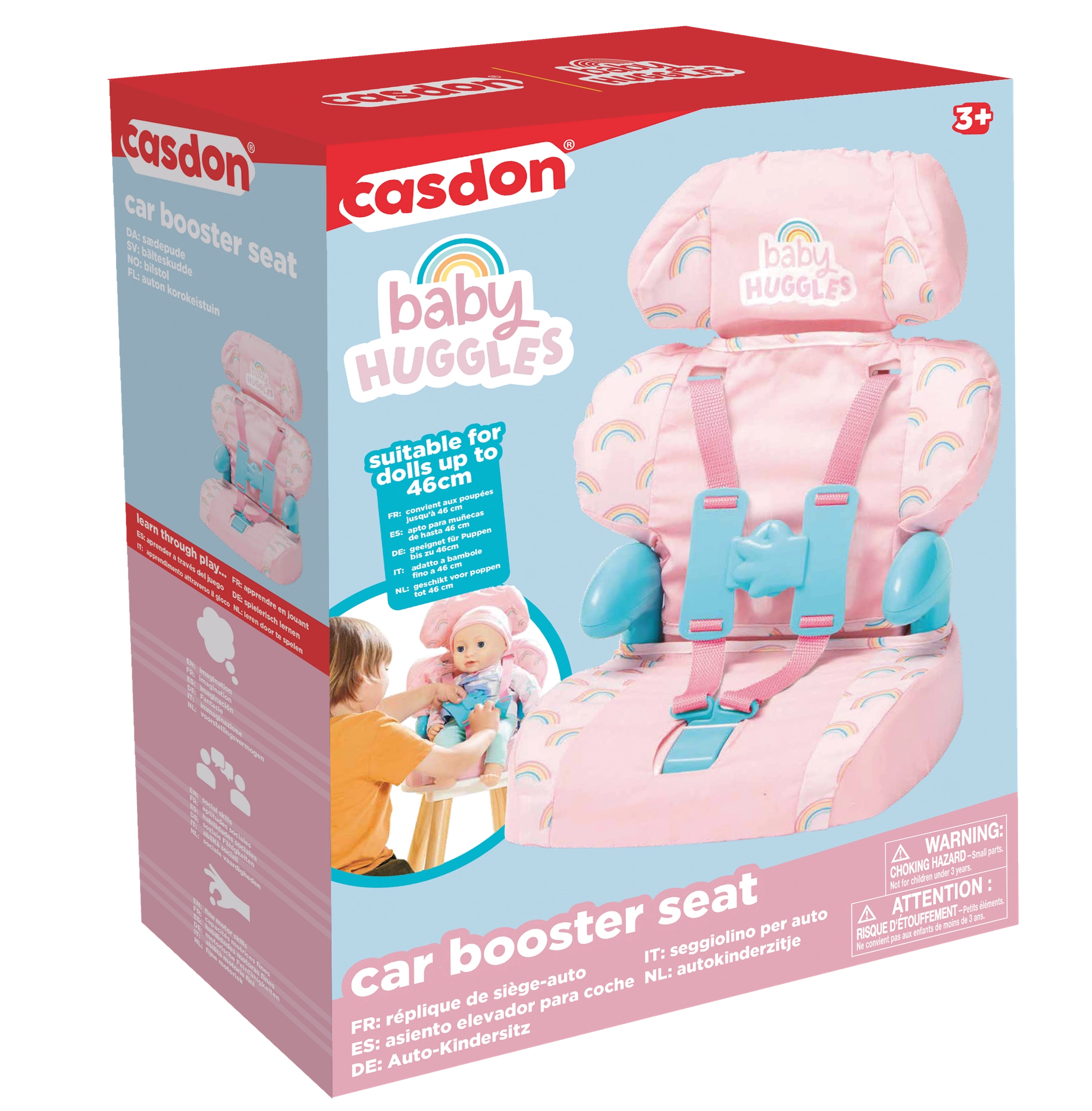 Privoščite otrokom realistično igro z avtosedežem za punčke BABY HUGGLES znamke CASDON. Sedež v rožnato-mavričnem dizajnu ima mehko oblazinjenje, udobna naslonjala in nastavljive pasove s preprosto zaponko, da punčka ostane varno pripeta. Zaradi lahke in stabilne konstrukcije je enostaven za prenašanje in uporabo doma ter na poti.