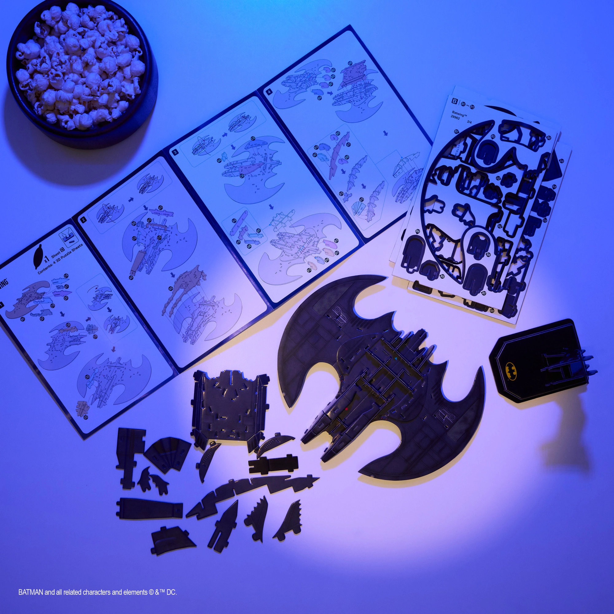 Ustvarite si ikonični Batwing korak za korakom. Deli se le iztisnejo iz plošč in po navodilih sestavijo v čvrst model z avtentičnimi linijami in širokimi krili. Končni model izstopa na priloženem stojalu in polepša vsako polico oboževalca sveta DC.